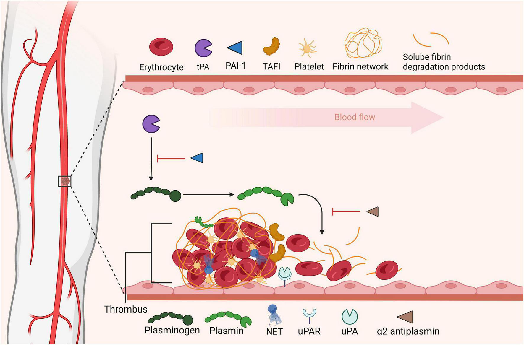 Thrombosis is the underlying pathology of major cardiovascular diseases, including myocardial infarction, ischemic stroke, and venous thromboembolism (VTE) which encompasses deep vein thrombosis and pulmonary embolism. Despite advances in diagnostics and novel antithrombotic drugs the mortality rate remains at 1 in 4 worldwide, creating a considerable burden on healthcare and society (1). In addition, thrombosis is a major cause of mortality in other disease, such as cancer, pathogenic infections, and autoimmune diseases (2–4). Hemodynamic forces and anatomic location significantly impact the formation, structure and stability of a thrombus within the vasculature. The resulting thrombi are heterogenous in nature, comprised of varying degrees of fibrin, platelets, erythrocytes, leukocytes, and neutrophil extracellular traps (NETs) (5). Thrombotic structures also vary within the arterial, venous, and microcirculation, at areas of turbulent flow, arising from atherosclerotic lesions, prosthetic devices or irregular vessel geometries and in different anatomic sites, such as the lung or ventricles of the heart (6). Analysis of thrombi has been hampered by availability of fresh samples, however, advancements in thrombectomy to remove thrombi from human blood vessels provided opportunities to examine the structure and composition of a thrombus (7). In addition, various ex vivo and in vivo models of thrombus formation and thrombolysis have provided useful tools to understand thrombus initiation in different vascular beds, the composition of various thrombus components, impact of shear and their downstream impact on fibrinolysis (8–12). Developing an understanding of thrombus composition, localization and abundance of fibrinolytic proteins in specific settings is crucial to personalize antithrombotic treatment strategies and develop novel drugs to target thrombosis.