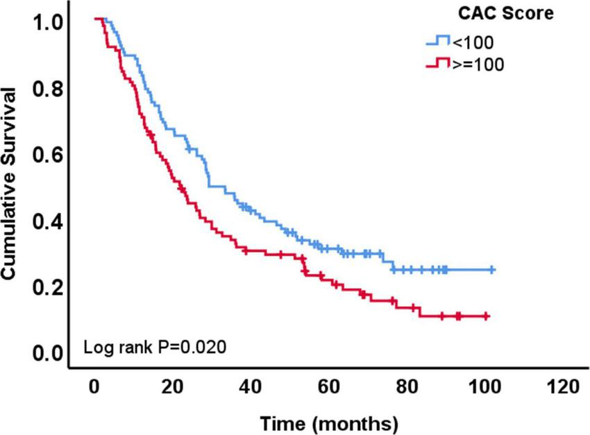 Overall survival of patients with coronary artery calcium (CAC) score <100 AU vs. those with ≥100 AU.