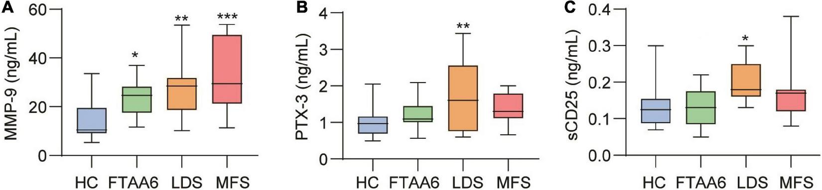 (i) All groups of HTAD patients had increased levels matrix metalloproteinase-9 (MMP-9) as compared with healthy controls, also in adjusted analyses, reflecting altered ECM remodeling. (ii) LDS patients had increased levels of pentraxin 3 (PTX3), reflecting systemic inflammation. (iii) LDS patients have increased levels of soluble CD25, a marker of T-cell activation.