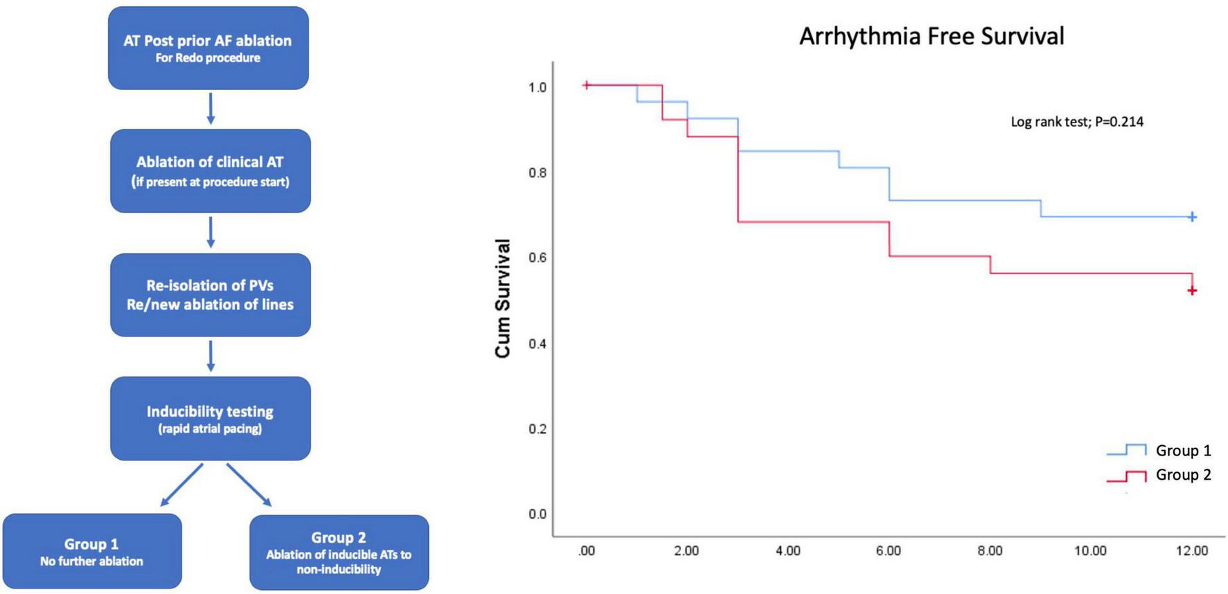 Study design (left panel) and results (right panel) from the randomized Inducath study. No difference in arrhythmia-free survival was seen between those undergoing ablation of inducible atrial tachycardias (ATs) to non-inducibility compared to those undergoing ablation of the clinical AT only.