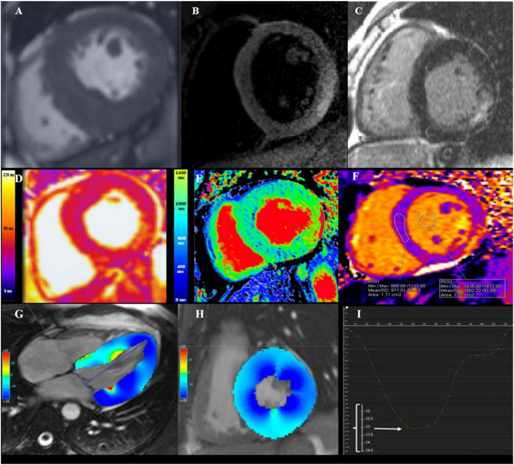 Cardiovascular magnetic resonance (CMR) assessment in Fabry disease (FD). (A) Steady state free precession (SSFP) CINE short-axis view showing increased wall thickness of mid-inferoseptum measuring 22 mm. (B) Dark-blood T2 short inversion-time, inversion-recovery (STIR) image showing myocardial edema (arrowheads) in the basal inferolateral wall (BIFL). (C) Late gadolinium enhancement (LGE) imaging showing mid-myocardium BIFL LGE in short-axis view. (D) Native T2 mapping showing high myocardial T2 value in BIFL (54 ms; normal reference value 45 ± 2 ms for this 1.5 T scanner). (E) Native T1 mapping showing low myocardial T1 value in the septum (812 ms; normal reference value 984 ± 18 ms for this 1.5 T scanner). (F) Native T1 mapping in advance disease showing pseudonormalization of T1 value in the septum and increased T1 in the BIFL. (G) Long-axis CINE SSFP image with color-coded myocardial longitudinal strain map. (H) Short-axis CINE SSFP image with color-coded myocardial circumferential strain map. (I) Decreased global longitudinal strain of −13.2%, as the enlarged scale on the Y-axis showed [adapted from Roller et al. (16)].