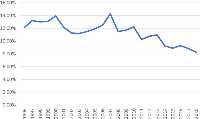 Proportion of isolated surgical aortic valve replacement patients who underwent previous cardiac surgery from 1996 to 2018.