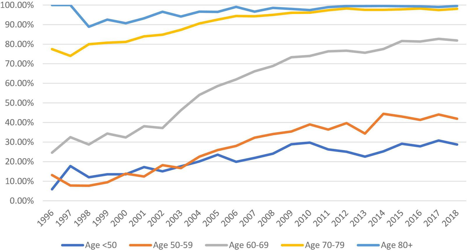 Biological aortic prosthesis use increased across all age groups from 1996 to 2018. Nearly, all patients above 70 s received a biological prosthesis since 2010 (98.09 and 99.52% in the 70–79 and >80 groups, respectively in 2018). The increase in the adoption of biological prostheses was most apparent in the 60–69 groups, from 24.59% to 1996 to 81.87% in 2018. There was also increased use of bioprostheses in patients below the age of 50 (28% in 2018) (Figure 4).