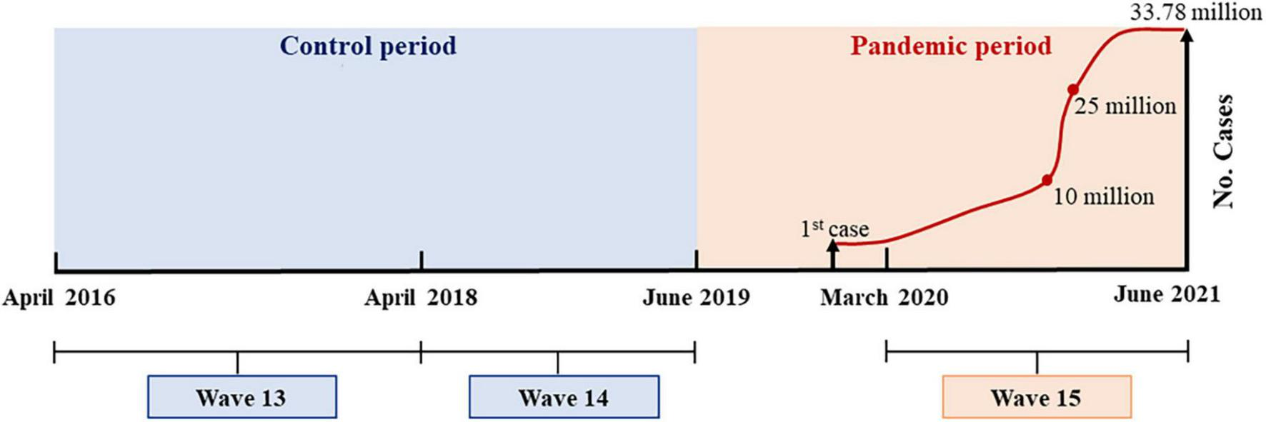The timeline of the present study is exhibited in Figure 1. The interval between HRS wave 13 (April 2016 to April 2018) and wave 14 (April 2018 to June 2019) was considered the control period. The interval between wave 14 and wave 15 (March 2020 to June 2021) was considered the pandemic period. The first confirmed COVID-19 case in the United States was reported on 20 January 2020 (19), and the number of cumulative-confirmed cases during HRS wave 15 from 1 March 2020 to 30 June 2021 elevated from 32 to 33.78 million.