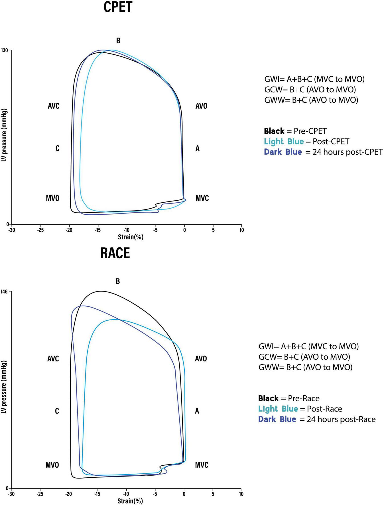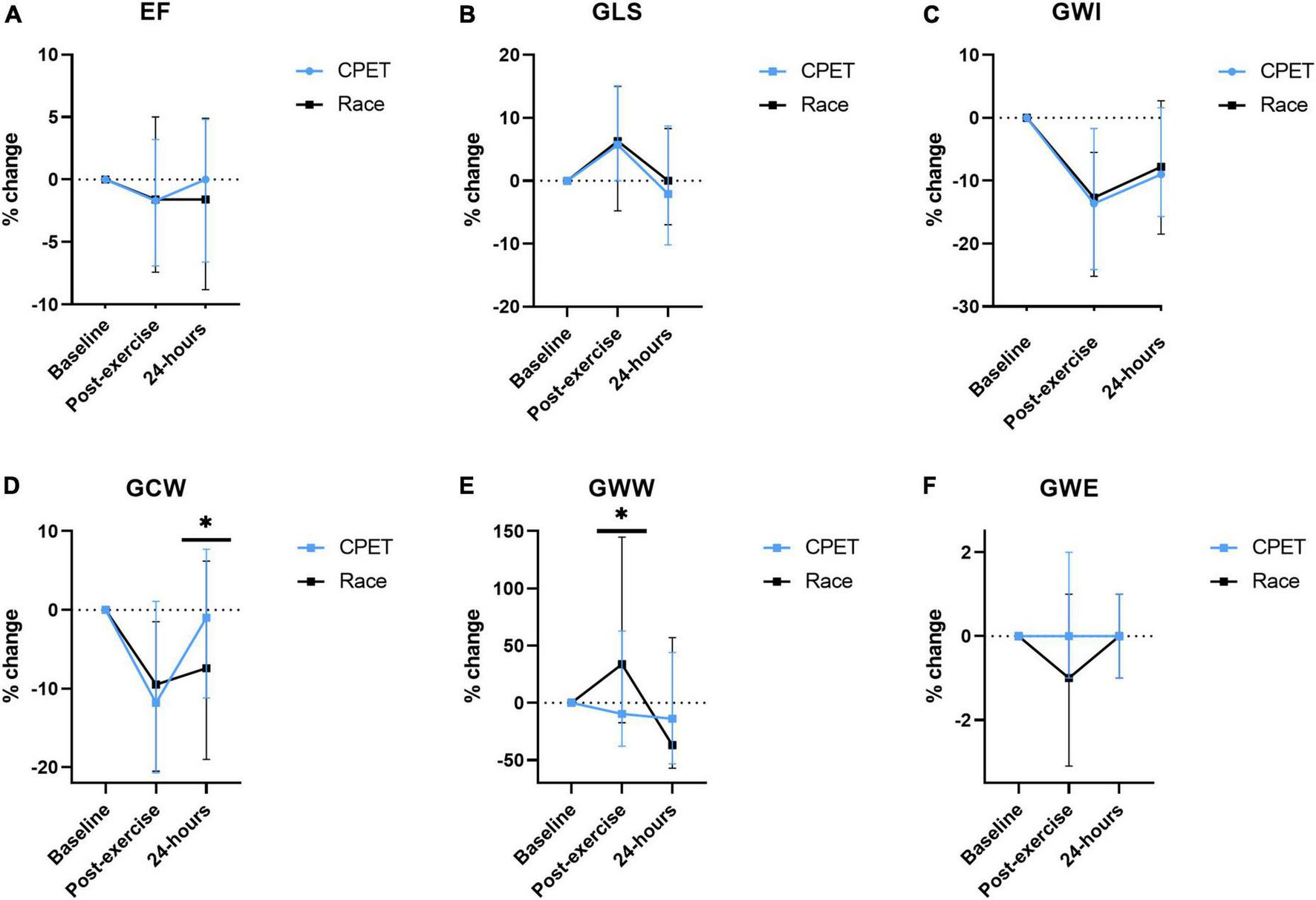 59 healthy recreational athletes, 52 (43–59) years of age, 73% males, were included. The race was longer and of higher intensity generating higher cTnI levels compared with the CPET (p < 0.0001): Race/CPET: exercise duration: 230 (210, 245)/43 (40, 45) minutes, mean heart rate: 154 ± 10/132 ± 12 bpm, max cTnI: 77 (37, 128)/12 (7, 23) ng/L. Stroke volume and cardiac output were higher after the race than CPET (p < 0.005). The two exercises did not differ in post-exercise changes in LV ejection fraction (LVEF) or global longitudinal strain (GLS). There was an increase in global wasted work (p = 0.001) following the race and a persistent reduction in global constructive work 24 h after exercise (p = 0.003).