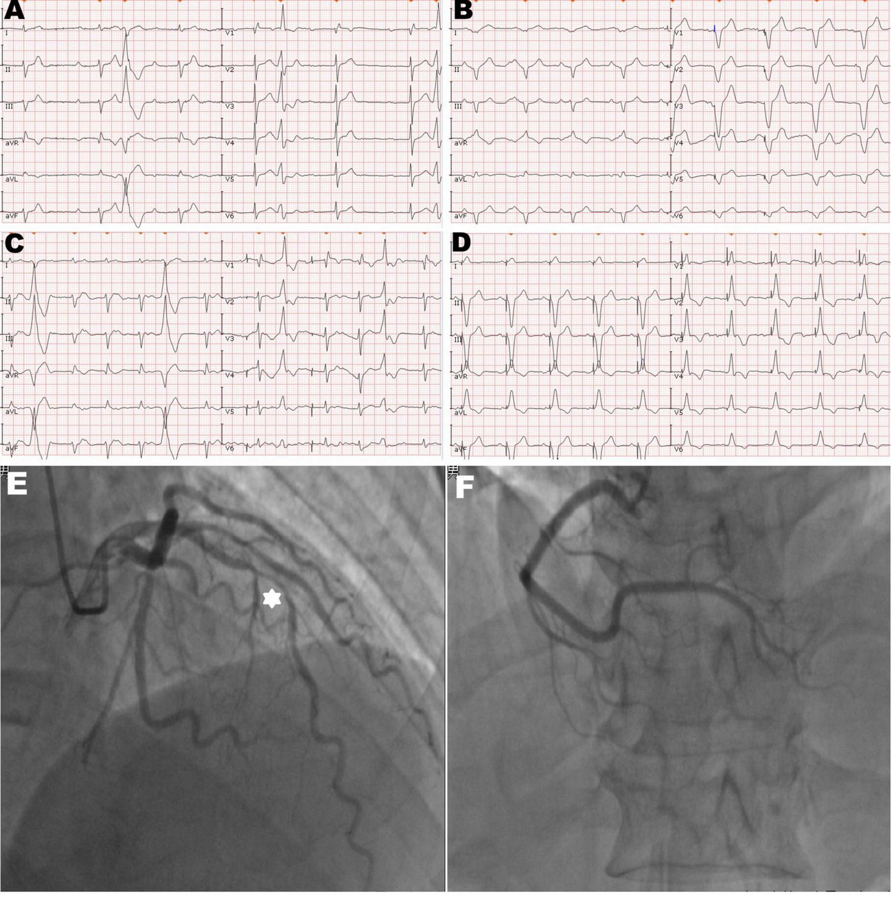 Twelve-lead electrocardiogram and coronary angiogram of the patient. (A) The initial electrocardiogram on the admission day showed complete atrioventricular block with frequent premature ventricular contractions. (B) The electrocardiogram immediately after pacemaker (PM) implantation showed the left bundle branch block pattern and the pacing model was VAT. (C) The electrocardiogram on the second post-operative day (POD) showed ventricular pacing failure. (D) The electrocardiogram after transvenous lead extraction and re-fixation showed the right bundle branch block and left axis deviation, and the right ventricular (RV) lead was refixed at the lower RV septum. (E) Hexagonal star symbol shows a diffuse atherosclerotic stenosis was observed in the middle segment of the left anterior descending branch, thus leading to insufficient coronary blood supply on the mid-portion of the interventricular septum. (F) Right coronary artery was relatively normal.
