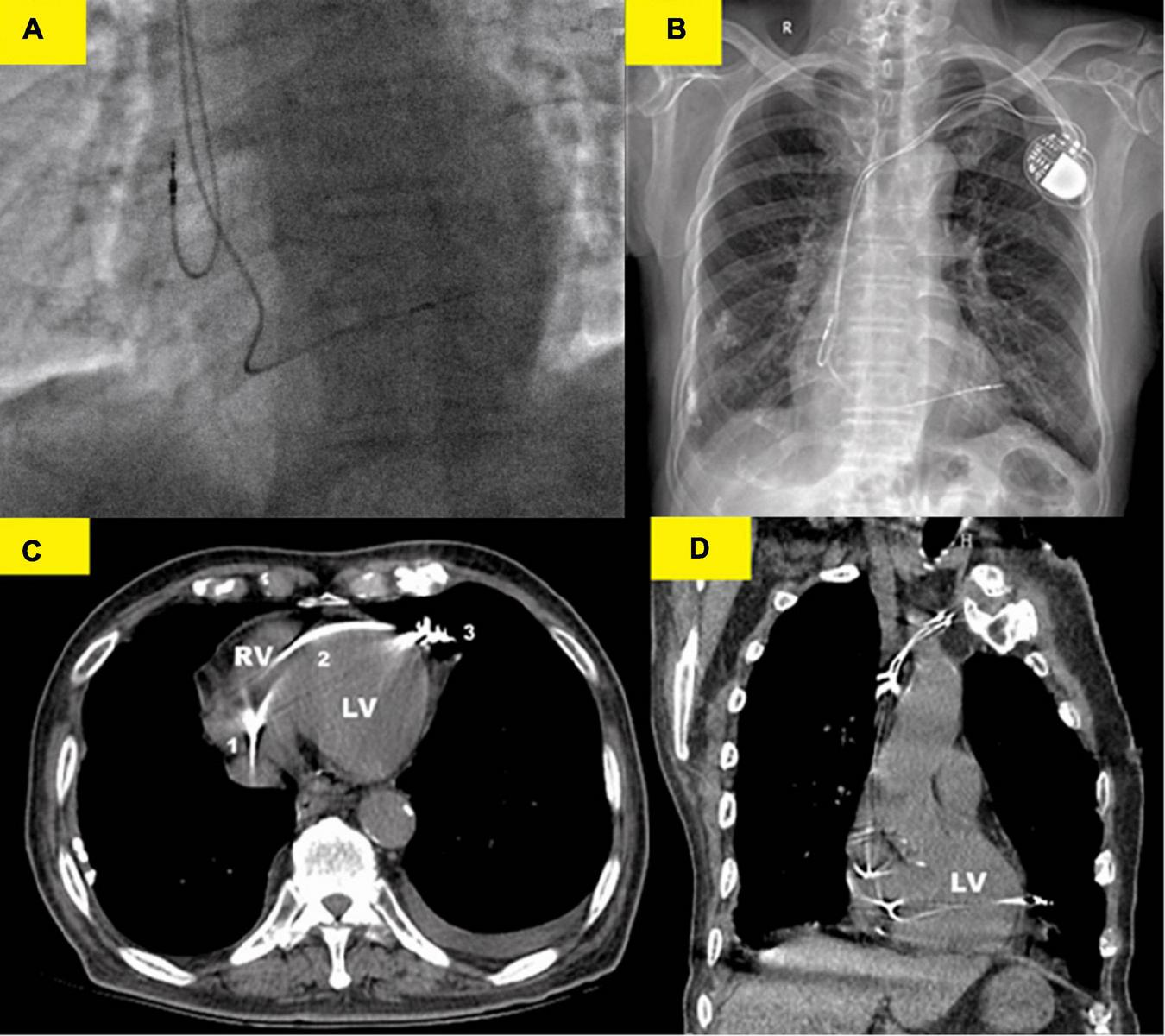 Various imaging modalities showed the lead perforation. (A) X-ray fluoroscopy image (right anterior oblique 30°) immediately after implantation showed that the RV lead was placed at the right ventricular (RV) apex. (B) Chest x-ray showed that the RV lead was beyond the left cardiac margin and clearly migrated in the left hemithorax. (C) Thoracic computed tomography (CT) scan showed the RV lead course from the right ventricle (1) to the left cardiac margin (3) in the patient and perforation of the interventricular septum (2) was well-evident. (D) Coronal CT images confirmed the RV lead migration in the left hemithorax. Thoracic CT scan should, therefore, be regarded as the gold standard for the strategical management of this complication.