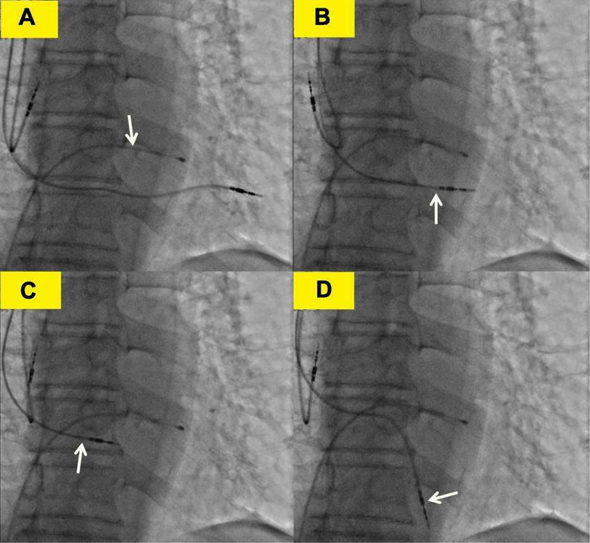 Transvenous lead extraction process. (A) The white arrow shows the lead of the temporary transvenous pacemaker. (B) The white arrow shows the right ventricular (RV) lead was screwed back to the left ventricle. (C) The white arrow shows the RV lead was screwed back to the right ventricle. (D) The white arrow shows the right ventricular lead was refixed at the lower right ventricular septum.
