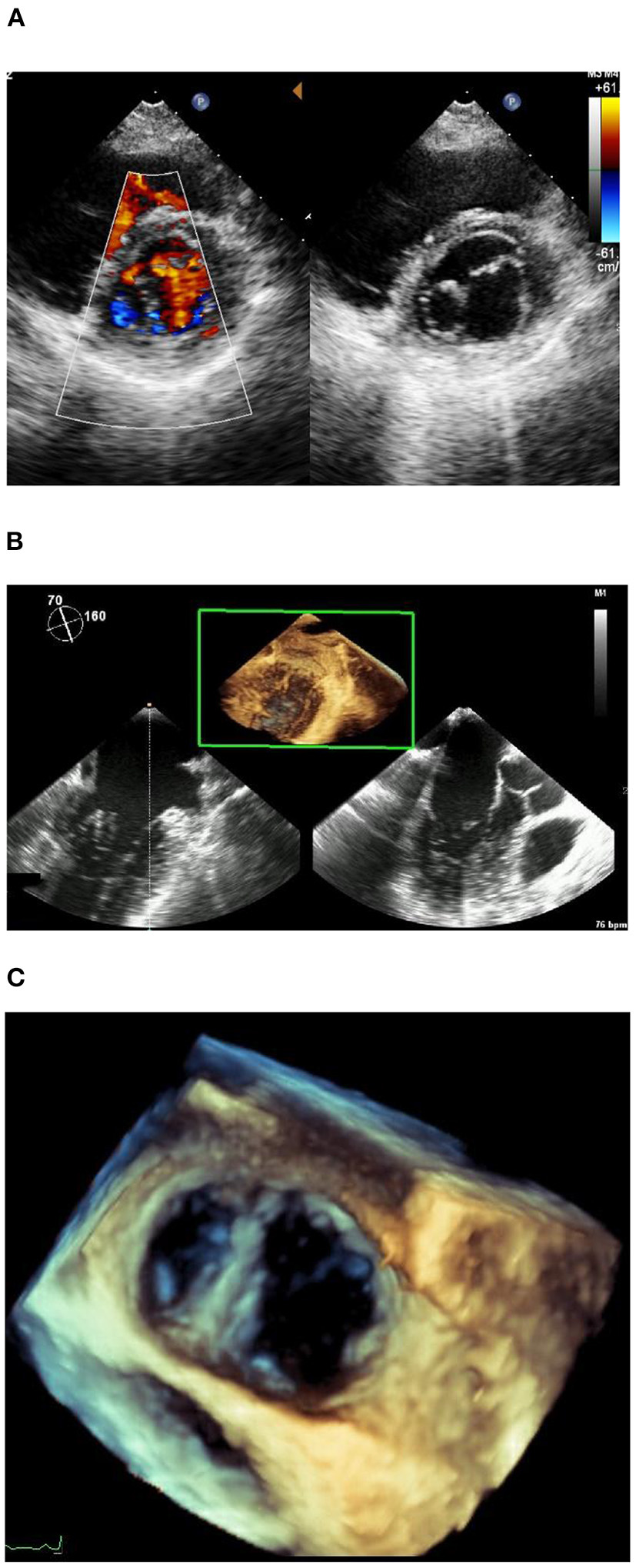 (A) Short axis of echocardiogram image. (B) Transesophageal echocardiogram. (C) Transesophageal echocardiogram.