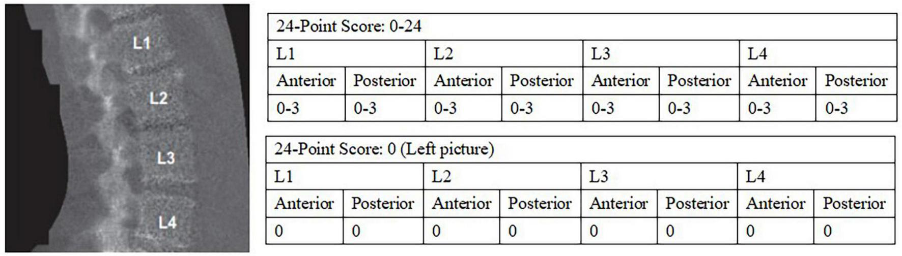 Abdominal aortic calcification (AAC) was gained by transverse scanning of the lumbar spine (vertebrae L1–L4) with dual-energy X-ray absorptiometry (DXA) (Densitometer Discovery A, Hologic, Marlborough, MA, USA) and semi-quantified by the Kauppila score system, with scores ranging from 0 to 24, and the specific scoring rules of AAC have been described in detail elsewhere, that is, as shown in Figure 2, the severity of calcification of the anterior and posterior walls of the abdominal aorta in each segment from L1-L4 was evaluated separately, and a score of 1 (< 1/3), 2 (1/3∼2/3) or 3 (> 2/3) was given according to the extent of calcification involvement in that segment, and the total score for each segment involved was the AAC score (0–24) for that patient (31–33). We divided AAC into two groups: no calcification (AAC = 0) and calcification (AAC > 0).