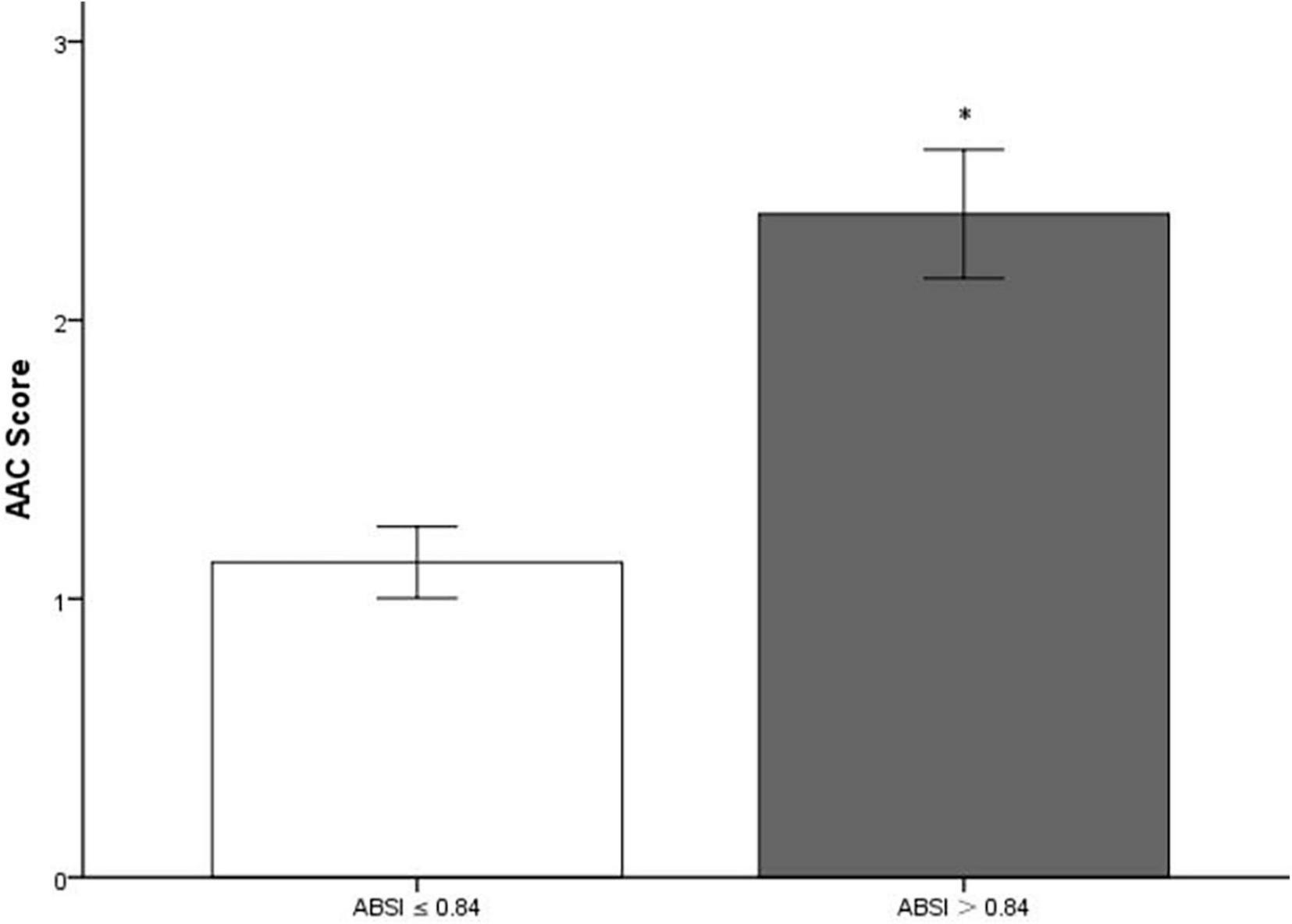 Bar graph of mean value of AAC score stratified by a body shape index (ABSI). AAC, abdominal aortic calcification. *Compared with lower a body shape index (ABSI) group, participants in higher ABSI group had significantly higher AAC score (P < 0.001).