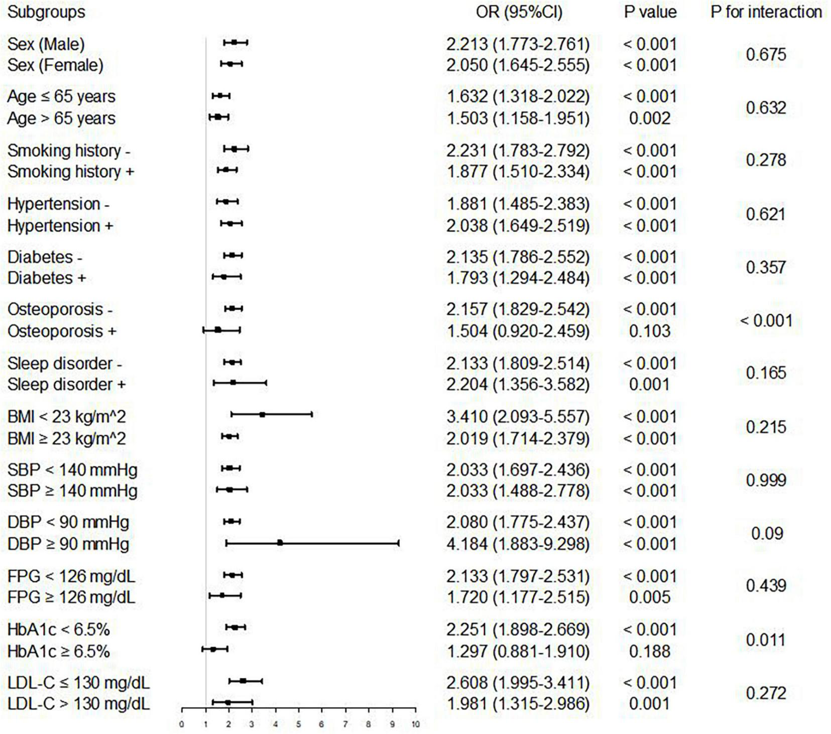 In multivariate logistic regression analysis, with the increase of confounding factors, higher ABSI remained to be an independent risk predictor of AAC, whether ABSI was regarded as a categorical or continuous variable (all P < 0.05 in Model 1–3) (Table 2). Further subgroup analyses (Figure 4) showed higher ABSI (regarding lower ABSI as reference) was consistently correlated with AAC in eleven subgroups, including sex, age, smoking history, hypertension, diabetes, sleep disorder, BMI, SBP, DBP, FPG, and LDL-C (P for interaction > 0.05). However, in the osteoporosis and HbA1c subgroups, the association was no longer synchronized (P for interaction < 0.05). Interestingly, the risk of participants with higher ABSI developing into AAC seemed to be more noticeable in participants without osteoporosis [OR (95% CI): 2.157 (1.829–2.542), P < 0.001] and with HbA1c < 6.5% [OR (95% CI): 2.251 (1.898–2.669), P < 0.001].