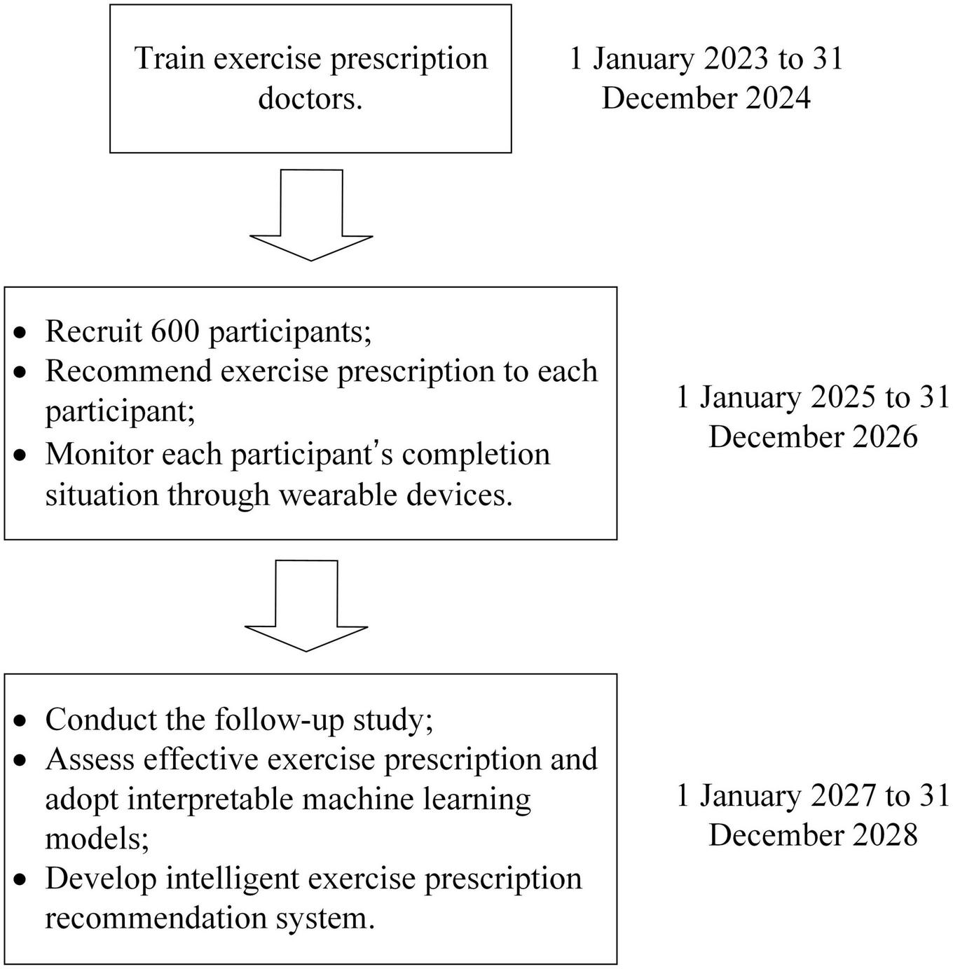 As for a dynamic recommendation system of exercise prescription, Tuka and Linhart discussed the possibility of utilizing AI and machine learning approaches for personalized exercise prescription recommendations for patients (16). More specifically, Chen et al. presented a hierarchical learning framework for Chinese kids’ physical exercise prescription (17). However, there is no existing studies have examined machine learning-based exercise prescription recommendations for cardio-oncology preventive care. Therefore, we aim to develop an interpretable machine learning-based intelligent system of exercise prescription for cardio-oncology preventive care and present the study protocol.