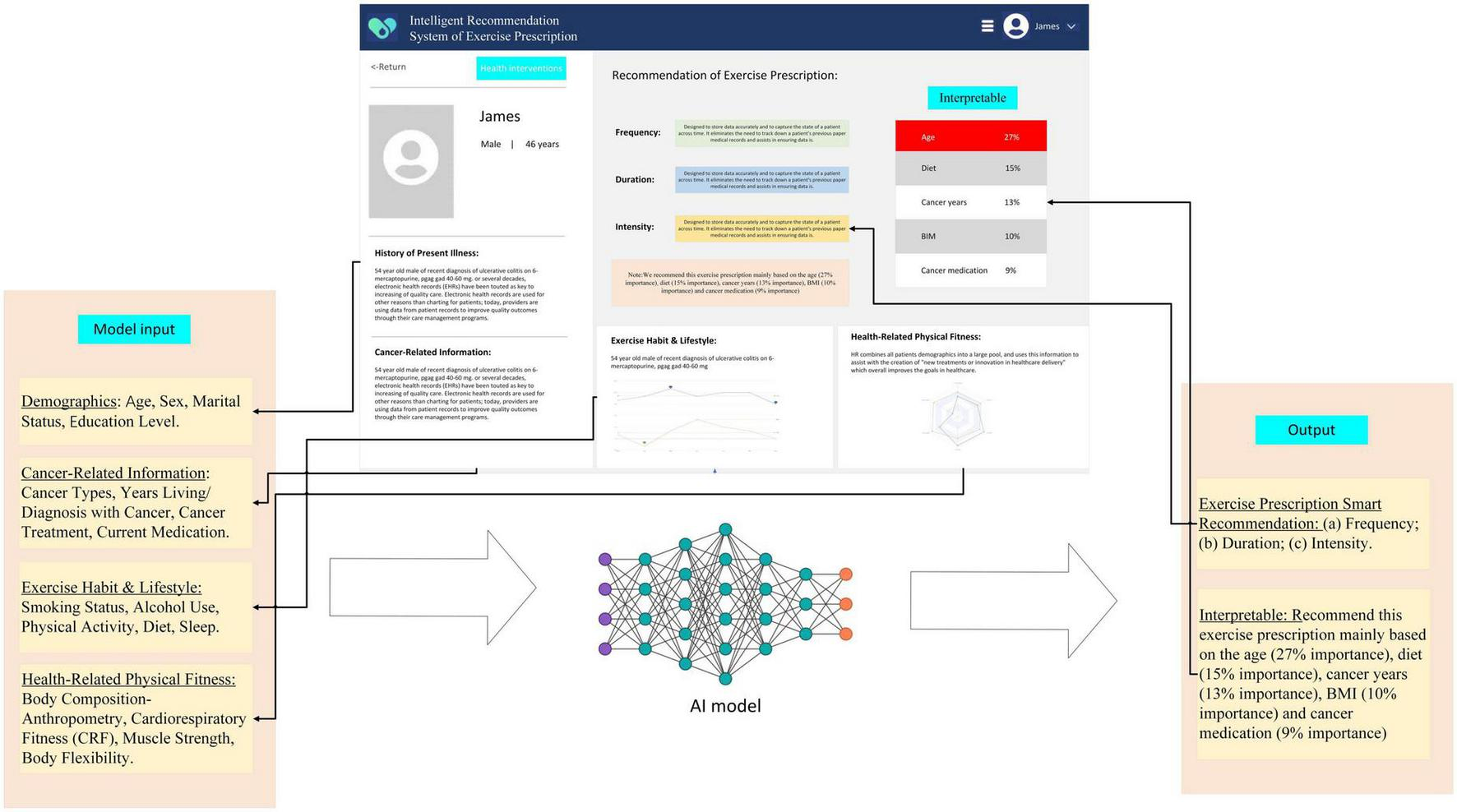 Considering both the model performance and the model interpretability, the intelligent exercise prescription recommendation system will be developed based on some machine learning models with both good interpretability and high performance. Figure 2 depicts an example of this intelligent system. It is noteworthy that our designed intelligent system will explain why it recommends specific exercise prescriptions.