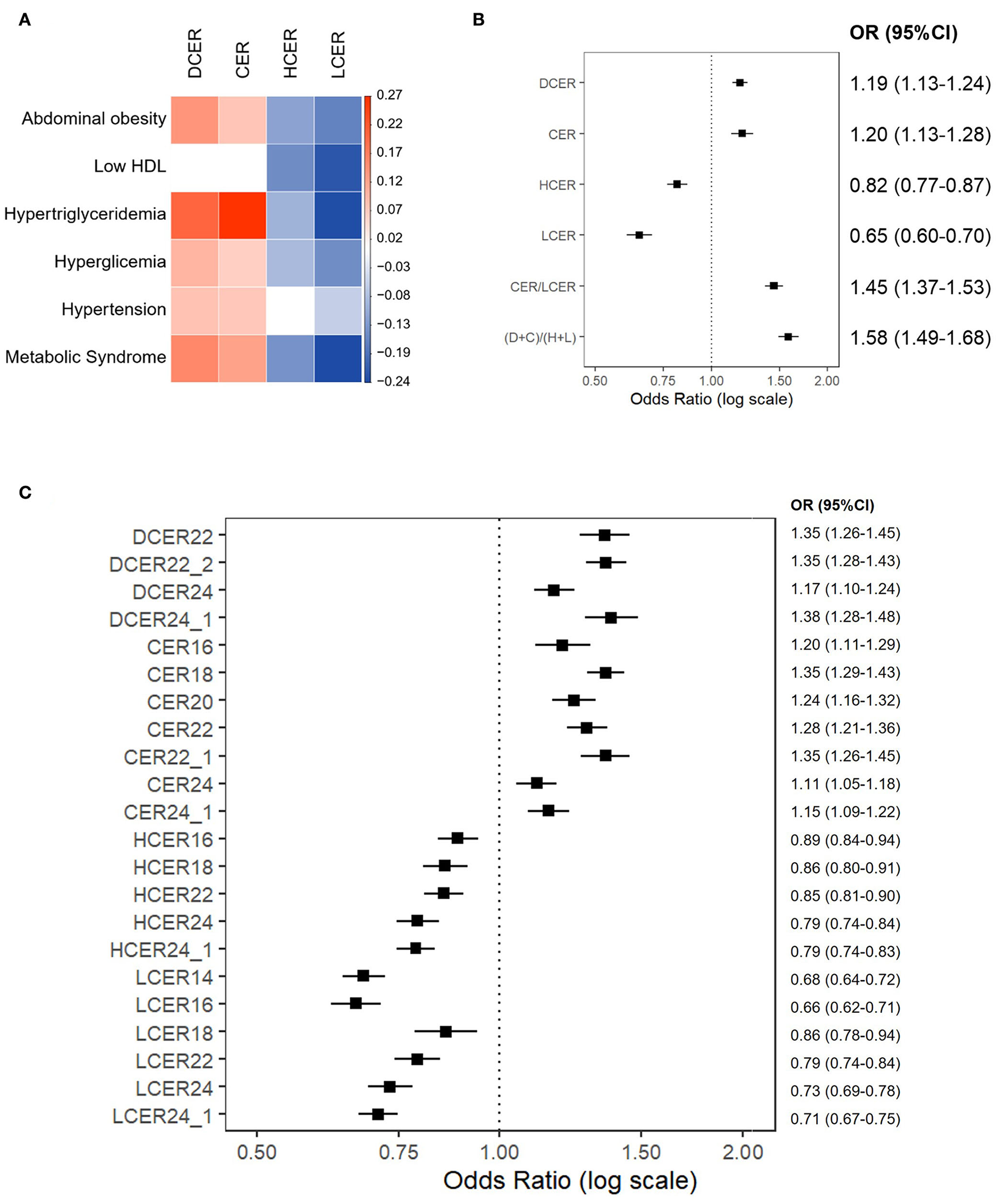Association of blood sphingolipid profile and metabolic syndrome. Binary logistic regression models for the association between MetS and its components with blood sphingolipid levels (log-transformed), adjusted for sex, age, race, and education. (A) Regression coefficient matrix of the adjusted logistic regression of MetS components with blood sphingolipid levels. Color label represents the regression coefficient of those associations with p<0.05 (positive in red, and negative in blue). (B) Odds ratios for MetS (with 95%CI) per increase in blood levels of sphingolipid classes, as well as CER/LCER and (DCER+CER)/(HCER+LCER) ratios. (C) Odds ratios for MetS (with 95% CI) per increase in blood levels of sphingolipid species.