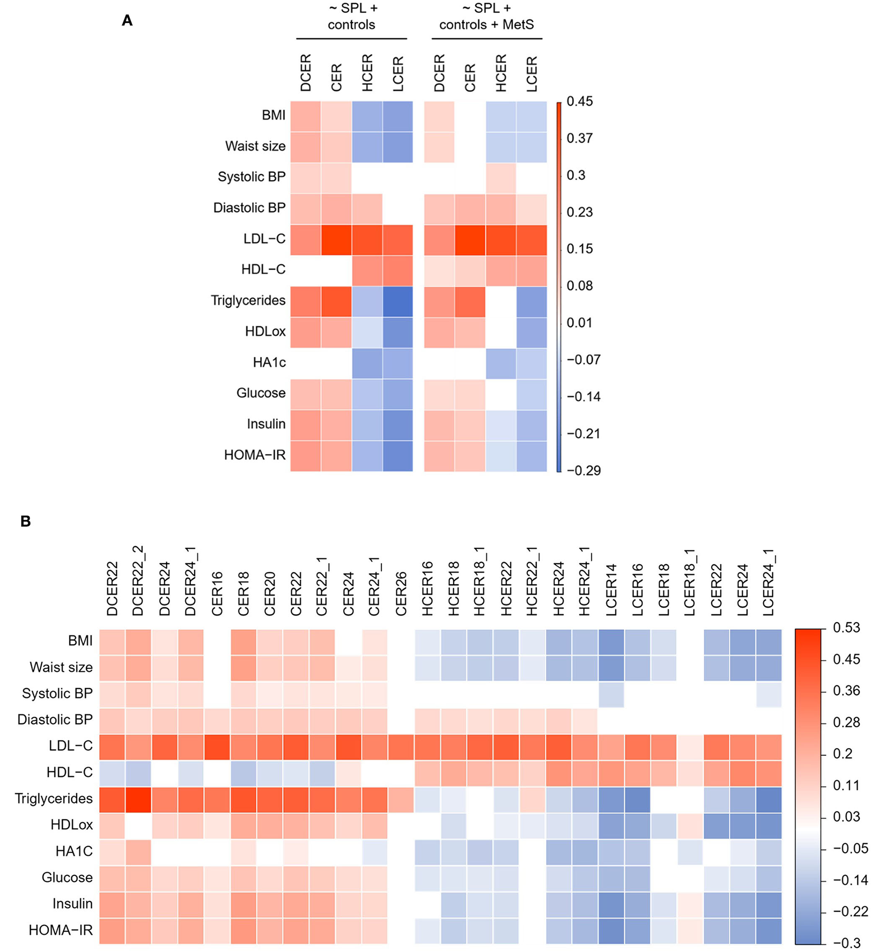 Adjusted linear regression of blood sphingolipid levels and health biomarkers. (A) Regression coefficient matrix of sphingolipid classes on health biormarkers adjusted for control variables (sex, age, race, and education) and MetS prevalence. (B) Regression coefficient matrix of sphingolipid species on health biormarkers adjusted for sex, age, race, and education. Color label represents the regression coefficient of those associations with p < 0.05 (positive in red, and negative in blue).