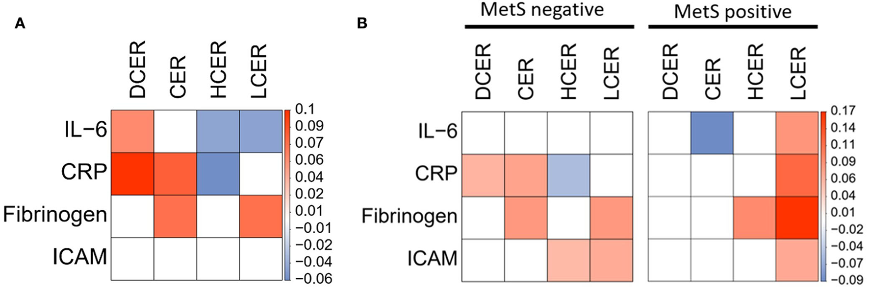 All biomarker values were log-transformed to achieve graphically normal data distributions and normalized using z-scoring. Associations between sphingolipids and the health biomarkers were evaluated using linear regression models (adjusting for sex, age, race, education attainment, and MetS diagnosis) and graphed as regression coefficient matrices. Color labels represent the regression coefficients. Associations between sphingolipids and MetS components were assessed using binary logistic regression models adjusted for sex, age, race, and education attainment. Regression effects were presented as odd ratios (OR) with 95% confidence interval (CI) or graphed in a regression matrix plot. To assess the relationship between inflammatory CVR biomarkers and sphingolipid levels in subjects with or without MetS, linear regression models were used, adjusting for sociodemographic variables (sex, age, race, and education attainment).
