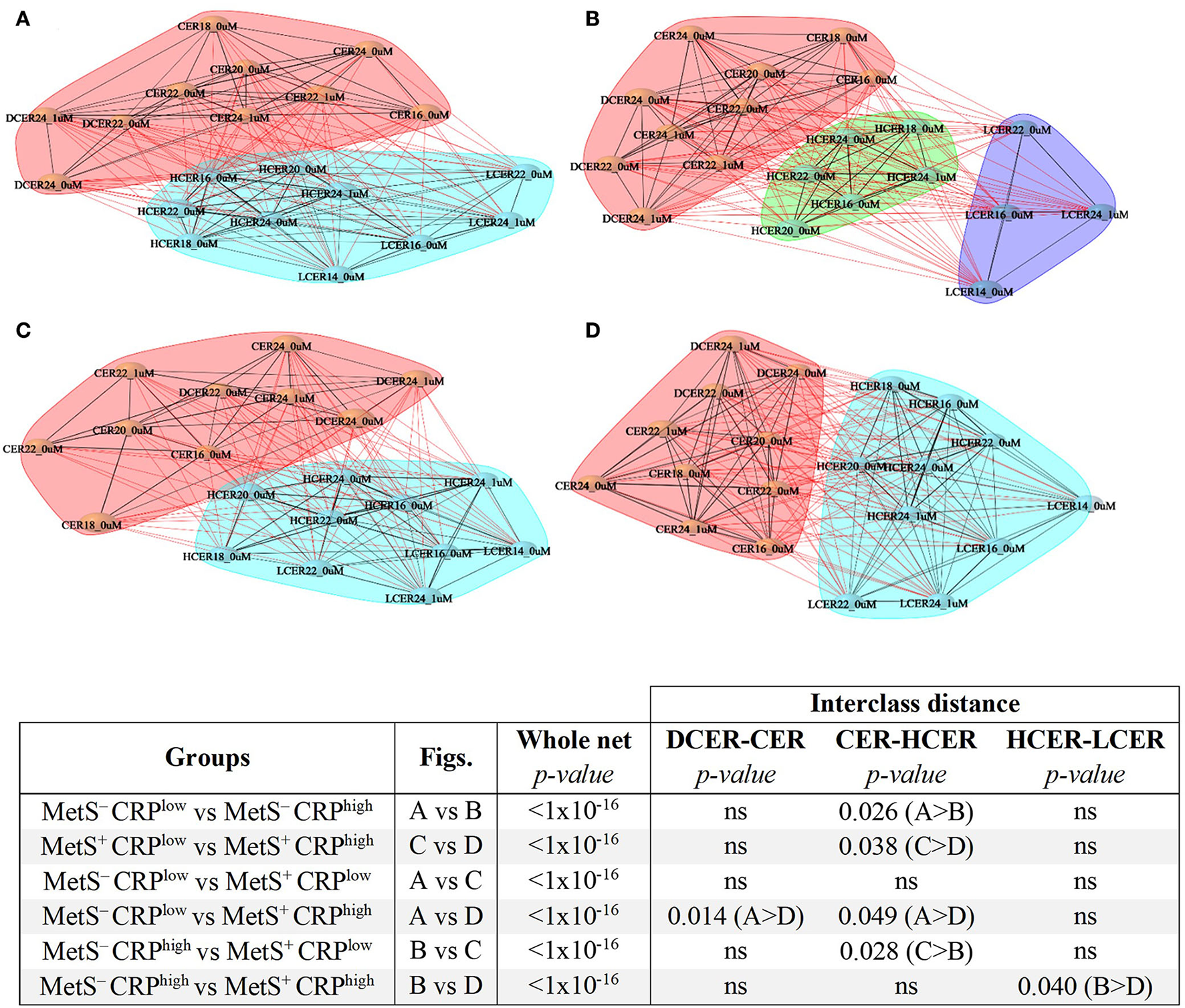 All participants were categorized with respect to MetS criteria (positive or negative) and blood levels of CRP (below or above the median). Sphingolipid distance network analyses were performed including the sphingolipid species selected in the volcano plot and built based on the absolute Spearman correlation distance (1-|ρ|), setting to 0 those coefficients with p ≥ 0.05 after Benjamin-Hochberg (BH) correction. Therefore, a shorter distance represents a higher correlation magnitude between two lipid species. To identify clusters, the fast greedy modularity optimization algorithm (26) implemented in the igraph R package (27) was used to directly optimize the modularity score by merging clusters pairwise iteratively. The same method was used to analyze the networks according to alterations in glucose metabolism. For this latter analysis, impaired glucoregulation included individuals who had high glucose >100 mg/dL and insulin ≥25 mIU/L. To assess the statistical difference between complete networks, the algorithm proposed by Steiger (28) for comparison of two distance matrixes was used, implemented in the “psych” R package (29). The distance between two sphingolipid classes was calculated as the average of distances between all pairs of lipids with one species of each class. A permutation test with 1,000 repetitions was used to determine the significance of the differences in interclass distances between different groups.