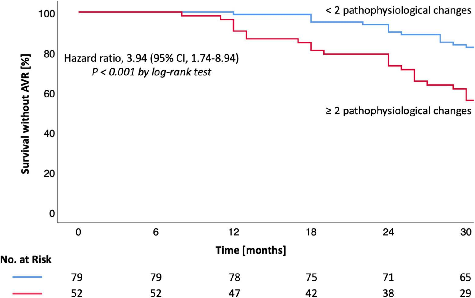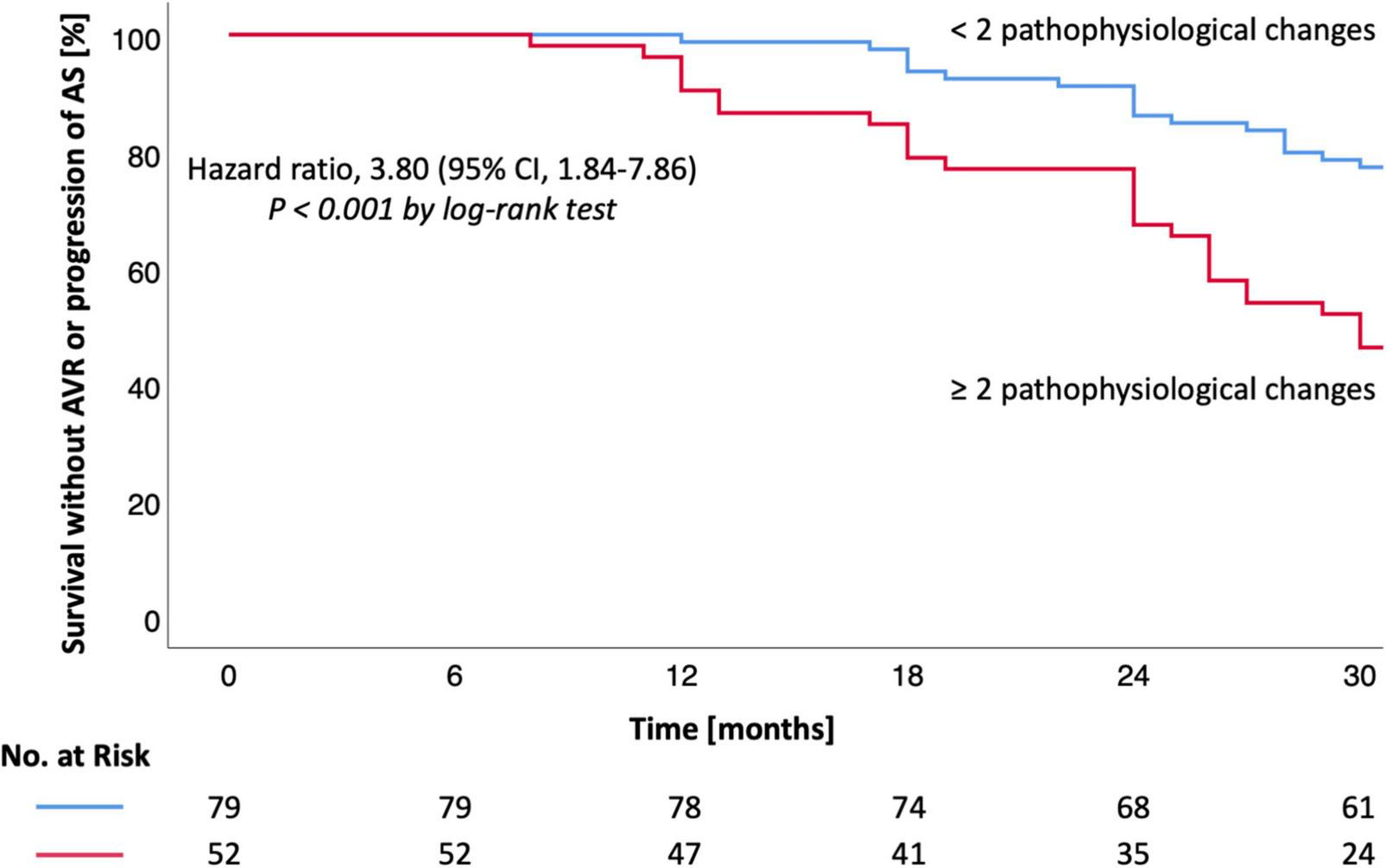 Moderate AS was defined by aortic valve area (AVA), peak transvalvular velocity (Vmax) or mean pressure gradient (PGmean). A total of 131 Patients were divided into two groups according to the number of pathophysiological changes (LVH, diastolic dysfunction with increased LV filling pressures and/or RV load): <2 (group 1); ≥2 (group 2). The primary outcome was survival without aortic valve replacement (AVR). After follow-up of 30 months, the reduction of AVA (–0.06 ± 0.16 vs. –0.24 ± 0.19 cm2, P < 0.001), the increase of PGmean (2.89 ± 6.35 vs 6.29 ± 7.13 mmHg, P < 0.001) and the decrease of the global longitudinal strain (0.8 ± 2.56 vs. 1.57 ± 3.42%, P < 0.001) from baseline to follow-up were significantly more pronounced in group 2. Survival without AVR was 82% (group 1) and 56% (group 2) [HR 3.94 (1.74–8.94), P < 0.001]. Survival without AVR or progression of AS was 77% (group 1) and 46% (group 2) [HR 3.80 (1.84–7.86), P < 0.001]. The presence of ≥2 pathophysiological changes predicted outcome whereas age, comorbidities, LDL-cholesterol did not.