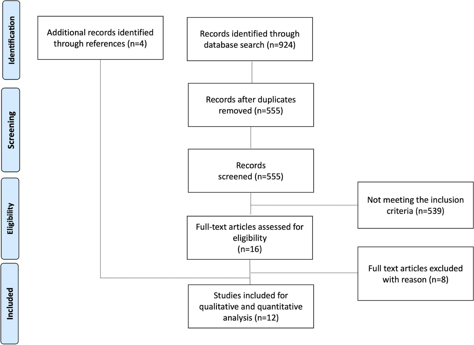 The search strategy led to 924 results in December 2022 after updating the initial search from September 2021. Removal of duplicates resulted in 555 studies potentially eligible for analysis. Another 535 were removed, because they did not meet the inclusion criteria. Five studies were removed after full text analysis due to lack of explicit mortality data for subgroups or because all patients were treated with VA-ECMO + IABP (13–17). Two more were removed as an ECMO only strategy was compared to ECMO + IABP/Impella or + IABP/pVAD (18, 19). One further registry from Japan was excluded as it included less patients than the Japanese registry study we included (20). Four studies were identified by additional records. Finally, 12 studies were included for qualitative and quantitative analysis (Figure 1; 21–32). None of these were randomized controlled trials but 11 were case series and one was a national register (Table 1). Seven studies were conducted in Asia (21–25, 29, 30), three in Europe (26, 28, 32), and one in the US and Australia (27, 31). In total 5,063 patients with cardiogenic shock after myocardial infarction were included, 1,136 patients were treated with VA-ECMO and 3,927 received VA-ECMO and IABP. The methodological quality of all included studies according to the 9-point Newcastle-Ottawa scale is presented in Table 1. All studies showed an acceptable score.