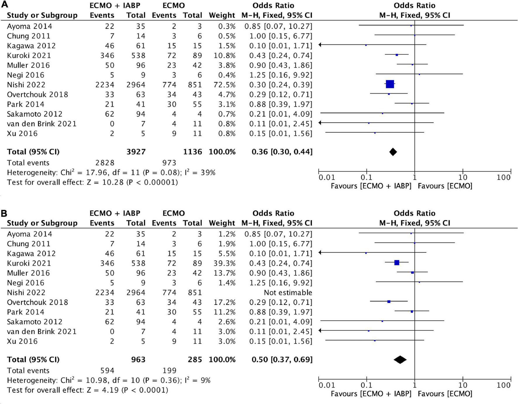Forest plot on 30-day survival ECMO + IABP vs. ECMO. (A) All included studies. (B) Subgroup analysis excluding Nishi et al. from 2022. Individual studies and pooled analysis showing a significant decreased 30-day mortality for patients in cardiogenic shock due to acute myocardial infarction treated with ECMO + IABP compared to patients with ECMO only (p = 0.003). CI, confidence interval; OR, odds ratio.