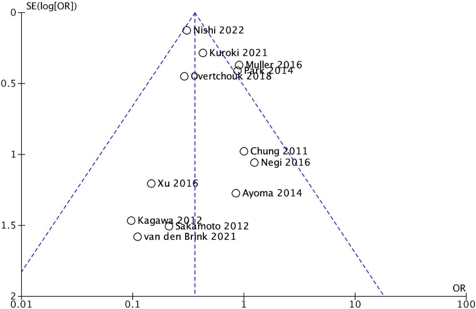 Four studies reported the 30-day/in-hospital mortality (23–25, 28) and eight studies the in-hospital mortality (21, 22, 26, 30–33). Overall mortality was 75.1% (n = 3802) and 85.6% (n = 973) in the VA-ECMO and 72% (n = 2829) in the VA-ECMO + IABP group. The in-hospital/30-day mortality was reported in all studies, the conducted meta-analysis showed that patients treated with VA-ECMO + IABP had a significantly lower odds ratio for mortality (OR 0.36, 95% CI 0.30–0.44, P ≤ 0.001; Figure 2A), with low heterogeneity (I2 = 11%). A performed funnel plot showed that the study by Muller et al. might be at risk for reporting bias (Figure 3). A subgroup analysis was conducted in which the Japanese registry by Kuroki et al. was excluded to prohibit including patients multiple times. The overall 30-day/in-hospital mortality within the subgroup analysis including 1,248 patients (ECMO n = 285; ECMO + IABP 963) was 63.6% (n = 794), in the VA-ECMO 69.8% (n = 199) and in the VA-ECMO + IABP group 61.8% (n = 595) (Figure 2B).