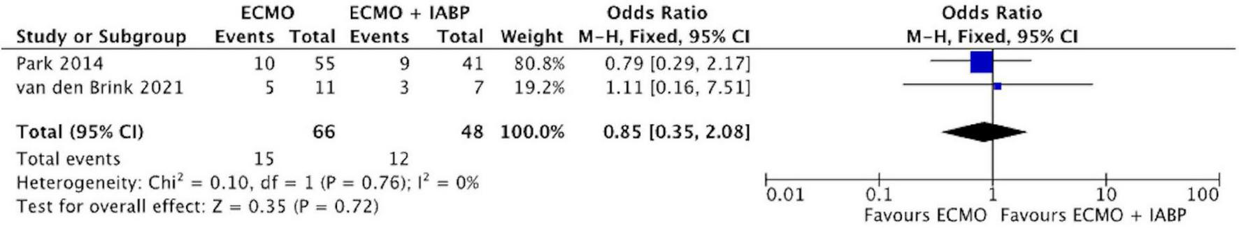 Two studies reported on their vascular complication rate, including 66 VA-ECMO and 48 VA-ECMO + IABP patients with a vascular complication rate of 22.7 and 25% (32, 33). The conducted meta-analysis of the vascular complication rate showed that ECMO only did not significantly lower the risk for vascular access complications (OR 0.85, 95% CI 0.35–2.08, P = 0.72; Figure 5), with low heterogeneity (I2 = 0%).