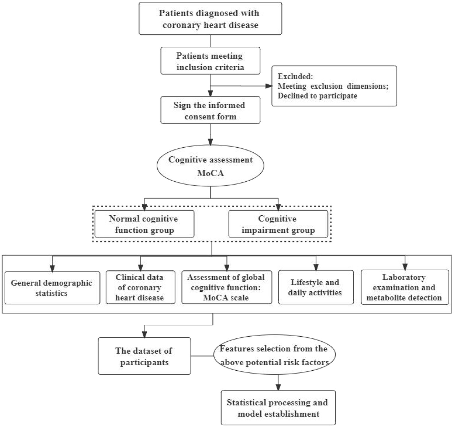 The cross-sectional study design will recruit 378 patients with CHD (≥65 years) from Xiyuan Hospital of China Academy of Chinese Medical Sciences. The subjects' cognitive function is evaluated with MoCA scale, and they are divided into cognitive impairment group and normal cognitive function group according to the score results. Demographic data, disease characteristics (results of coronary CT/ angiography, number of stents implanted, status of diseased vessels), laboratory tests (biochemistry, coagulation, serum iron levels, pulse wave velocity), metabolites (blood samples and intestinal metabolites), and lifestyle (smoking, alcohol consumption, sleep, physical activity) will be assessed as outcome indicators. Compare the two groups and the correlation analysis will be performed on the development of mild cognitive impairment. Mann-Whitney U or X2 test was selected to describe and evaluate the variation, and logistics regression analysis was employed to fit the prediction model. After that, do the calibration curve and decision curve to evaluate the model. The prediction model will be validated by a validation set.
