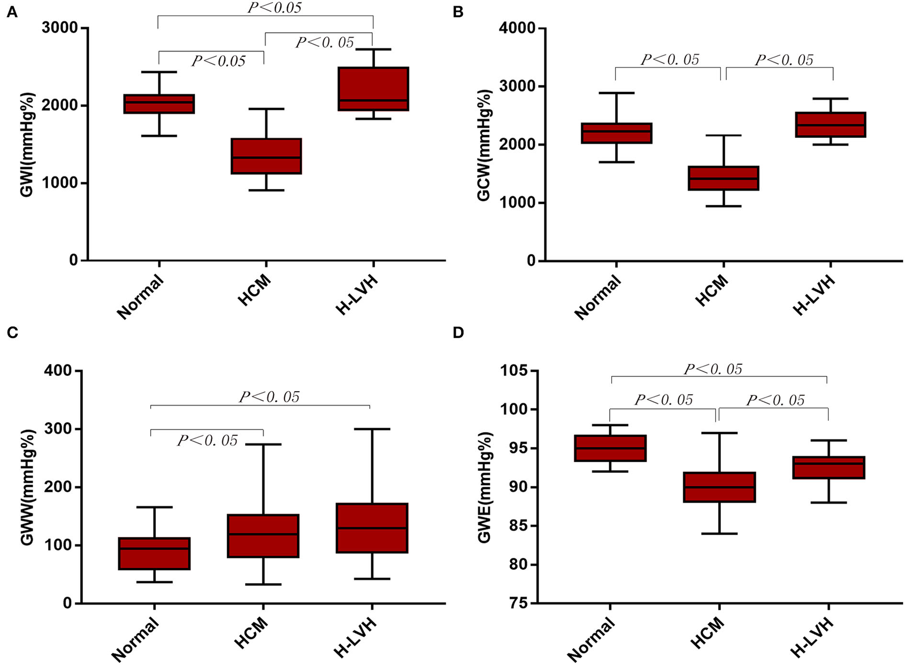 Compared to the control group, GWI and GCW were significantly lower in patients with HCM, and GWI was significantly higher in H-LVH patients (P < 0.05). Significantly decreased absolute values of GLS and GWE and markedly increased GWW was observed in patients with HCM and H-LVH (P < 0.05). The absolute value of GLS, GWI, GCW, and GWE were significantly decreased in patients with HCM than those in H-LVH patients (P < 0.05; Table 3 and Figure 2).