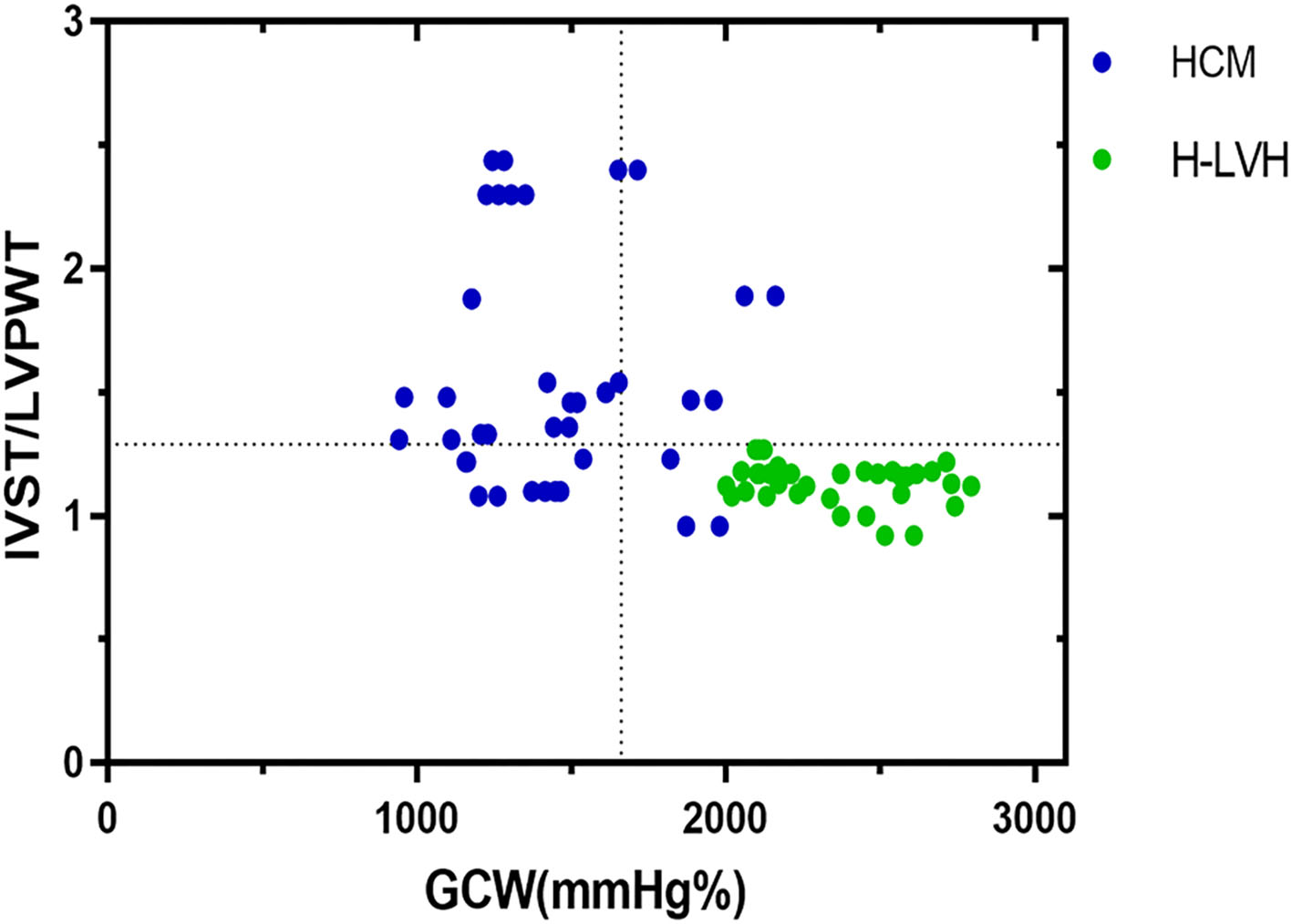 Compared to the control group, GWI and GCW were significantly lower in HCM patients (P < 0.05), whereas GWI was significantly higher in H-LVH patients. GWW was higher and GWE was significantly decreased in both HCM and H-LVH patients than in the control group (P < 0.05). Multivariate discriminant analysis and ROC curve revealed that the inter-ventricular septum thickness (IVST)/left ventricular posterior wall thickness (LVPWT) and GCW were each able to distinguish HCM from H-LVH. The combination of IVST/LVPWT and GCW discriminated HCM and H-LVH with a higher predictive accuracy of 94.7%.