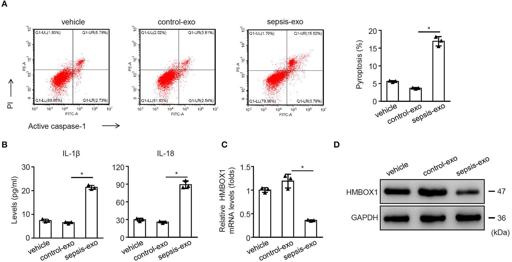 Exosomes (exos) derived from sepsis patients (sepsis-exos) were isolated using ultracentrifugation. Rats were subjected to cecal ligation and puncture surgery and treated with sepsis-exos. HMBOX1 was knocked down or overexpressed in AC16 cells using lentiviral plasmids carrying short interfering RNAs targeting human HMBOX1 or carrying HMBOX1 cDNA. Cell pyroptosis was measured by flow cytometry. The secretion of IL-1β and IL-18 was examined by ELISA kits. Quantitative polymerase chain reaction (PCR) or western blot was used for gene expression.