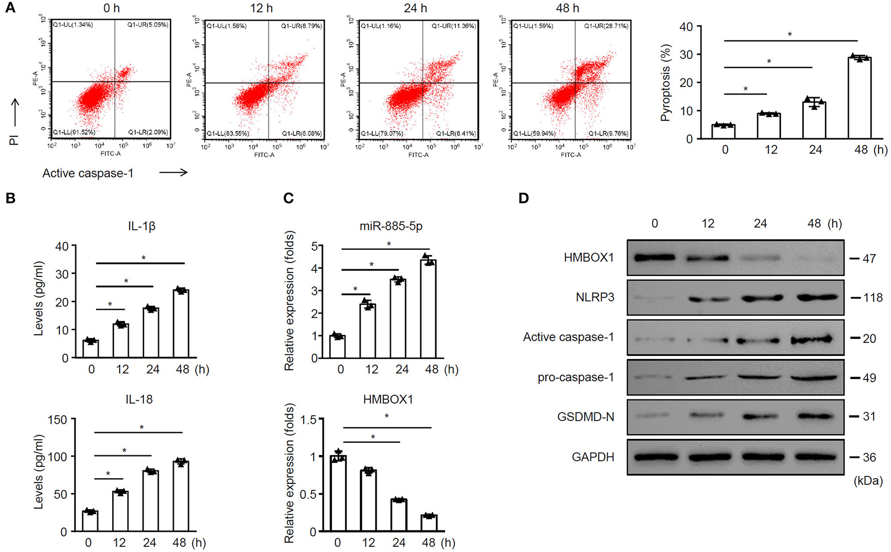 Sepsis-exos time-dependently promoted AC16 pyroptosis. AC16 cells were treated with sepsis-exos (50 μg/ml) for 0, 12, 24 and 48 h. (A) PI+caspase-1+ pyroptosis was measured by flow cytometry. Representative images were shown on the left and summarized results are on the right. (B) Supernatant levels of IL-1β and IL-18 were measured by ELISA. (C) Levels of miR-885-5p and HMBOX1 in cells was measured by qPCR. Data are normalized to expression levels of 0 h data. (D) Protein levels of HMBOX1, NLRP3, caspase-1, and GSDMD-N were measured by western blot. (A–C) Data are mean ± SD from three independent experiments (n = 3 per group). * p < 0.05.