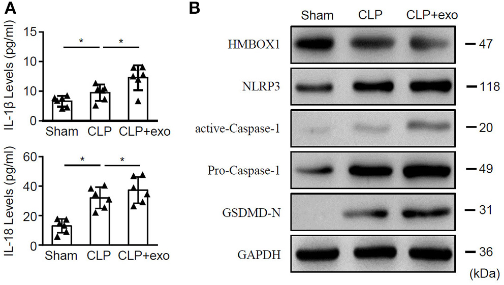 Sepsis-exos promote sepsis in vivo. Septic rats underwent CLP surgery were i.v. injected with sepsis-exos (100 μg/kg). Serum and heart tissues from sham, CLP, or sepsis-exo-treated mice were sampled 72 h after surgery. (A) Serum levels of IL-1β and IL-18 were measured by ELISA. Data are mean ± SD from three independent experiments (n = 6 mice per group). (B) Protein levels of HMBOX1, NLRP3, caspase-1, and GSDMD-N in hearts were measured by western blot. * p < 0.05.