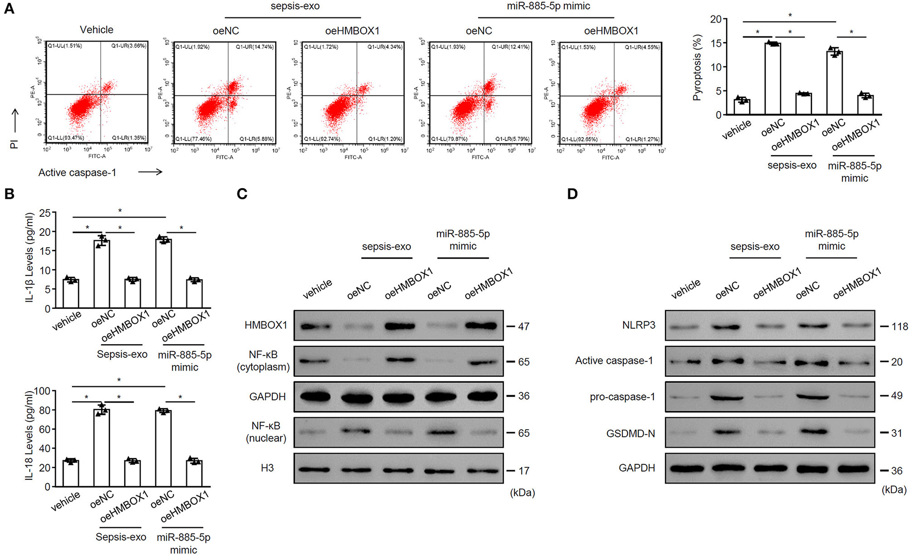 MiR-885-5p mimics and sepsis-exos showed similar effects. AC16 cells with HMBOX1 overexpression (oeHMBOX1) or not (oeNC) were treated with sepsis-exos (50 μg/mL) or miR-885-5p mimic for 24 h. (A) PI+caspase-1+ pyroptosis was measured by flow cytometry. Representative images were shown on the left and summarized results are on the right. (B) Supernatant levels of IL-1β and IL-18 were measured by ELISA. The protein levels of HMBOX1, NF-κB (cytoplasm), NF-κB (nuclear) (C) and NLRP3, caspase-1, GSDMD-N (D) were measured by western blot. (A,B) Data are mean ± SD from three independent experiments (n = 3 per group). *p < 0.05.