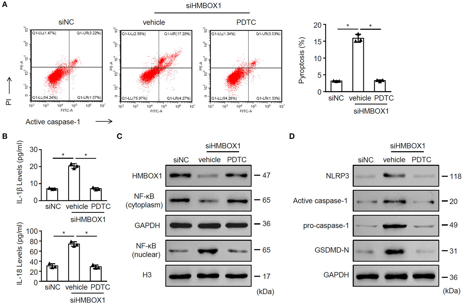 The NF-κB inhibitor PDTC rescued the function of HMBOX1 in AC16 cells. AC16 cells with HMBOX1 silencing (siHMBOX1) or not (siNC) were treated with NF-κB inhibitor PDTC (10 μM) for 24 h. (A) PI+caspase-1+ pyroptosis was measured by flow cytometry. Representative images were shown on the left and summarized results are on the right. (B) Supernatant levels of IL-1β and IL-18 were measured by ELISA. The protein levels of HMBOX1, NF-κB (cytoplasm), NF-κB (nuclear) (C) and NLRP3, caspase-1, GSDMD-N (D) were measured by western blot. (A,B) Data are mean ± SD from three independent experiments (n = 3 per group). * p < 0.05.