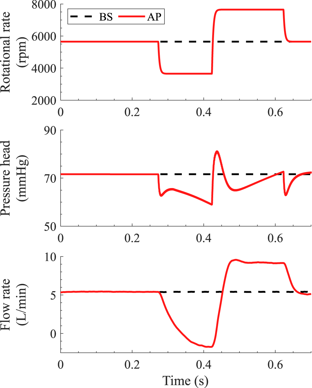 Different measures of scalar washout and residence time have been studied to compare the performances across different pumps or flow conditions. Molteni et al. (28) compared the outlet scalar washout of the CentriMag (Abbott, Chicago, Illinois, USA), HVAD, and the HMII for pump flow rates ranging between 1 and 5 L/min. After normalization for the effect of pump priming volume and flow rate, the time required for the residual OBS concentration at the pump outlet to drop below 50, T50, corresponded to 0.76–0.94 flush volumes for all the pumps and all the flow conditions. Time required to reduce the residual outlet OBS concentration to 5%, T05, showed higher variations, corresponding to 1.8–2.2 flush volumes for the HMII up to 2.6–2.8 in the HVAD and CentriMag. Deriving the outlet scalar washout from our results (Supplementary Material S4), the T50 in the HM3 under the baseline, high-, and low-flow conditions corresponded to 0.9 flush volumes for all the three conditions, while T05 ranged between 1.6 and 1.7. Zhang et al. (29) reported average residence times of 0.12, 0.20, and 0.18 s at the outlet of the CH-ventricular assist device (CH-VAD) (CH Biomedical Incorporation, Suzhou, China), HVAD, and the HM II for a pump flow rate of 4.5 L/min. A similar metric can be derived from the washout plots under constant operating conditions (Supplementary Material S5), yielding average residence times of 0.28, 0.18, and 0.11 s under the low-flow, baseline, and high-flow conditions, respectively. These average residence times correspond to 0.97 flush volumes for all the three conditions. By investigating the performance of the HVAD under different constant operating conditions, Granegger et al. (30) reported that the 90% washout time, defined as the time required to reduce the residual old blood concentration within the pump from 100% down to 10%, was 0.3 s at 5 L/min and 0.6 s at 2.5 L/min, scaling inversely with the flow rate. Mean blood transit times reported by Bourque et al. (11) for the HM3 also followed a perfect inverse-proportional relationship with the pump flow rate, with values of 0.587, 0.219, and 0.118 s at 2.0, 5.4, and 10.0 L/min, respectively. Similarly, in this study, the 95% washout of the HM3, defined as the number of flush volumes required to reduce the residual old blood concentration in the pump from 100 down to 5%, was comparable across tested conditions. Whether the AP was turned on or off, 95% washout was achieved within 1.3–1.4 flush volumes. Similar results were obtained by Boraschi et al. (17) under a different baseline condition, wherein the 95% washout time was 0.29 s at 5 L/min, translating to 1.4 flush volumes, a performance which appears reasonable when compared to the best possible scenario wherein 95% washout would be achieved in exactly 0.95 flush volumes. Altogether, despite the large and rapid changes in both the flow rate and rotor speed imparted by the AP, washout dynamics down to 95% pump washout are only marginally affected when normalizing for the effect of flow rate. Similarly, average residence times were primarily dictated by the flow rate, corresponding to the time to drive approximately one flush volume of blood through the pump. This suggest that, overall, the 95% washout is primarily determined by the pump flow, while the acceleration and deceleration rates of the rotor and flow only have a marginal effect. These further point to a predominant role of the pump internal design and smaller role of the AP at least for the washout of main flow paths.