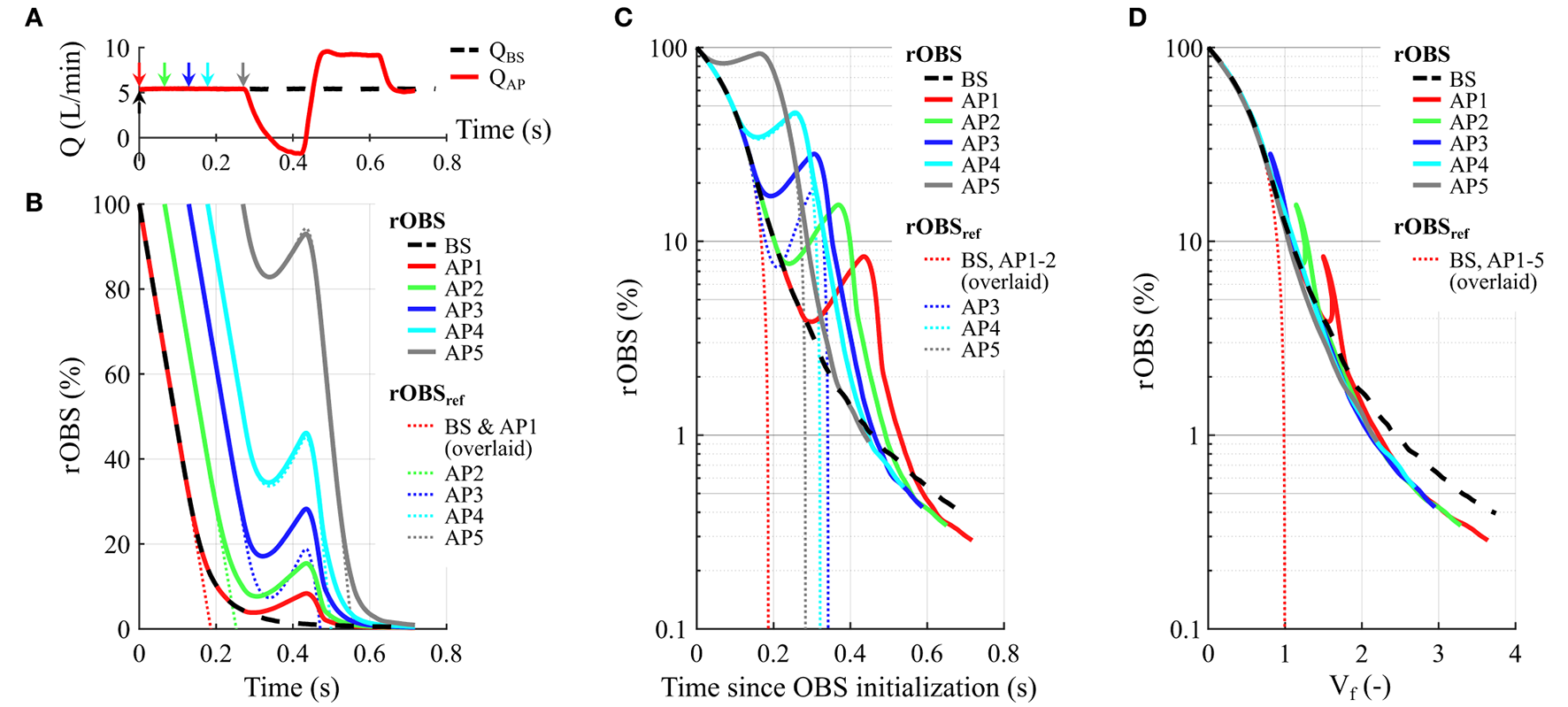 Under the simulated conditions, the low-speed phase of the AP leads to a transient flow reversal (Figure 3A) associated with an increase in all the rOBS (Figure 3B, AP1–5). This translates into a “shark fin” feature in Figure 3D because the net Vf, decreases for negative pump flow rates, reflecting backflow of old blood from the outflow graft into the pump. Flow reversal does not lead to a “shark fin” feature for rOBSAP4 and rOBSAP5, as the curves follow the reference washout curve, rOBSref, during that phase.