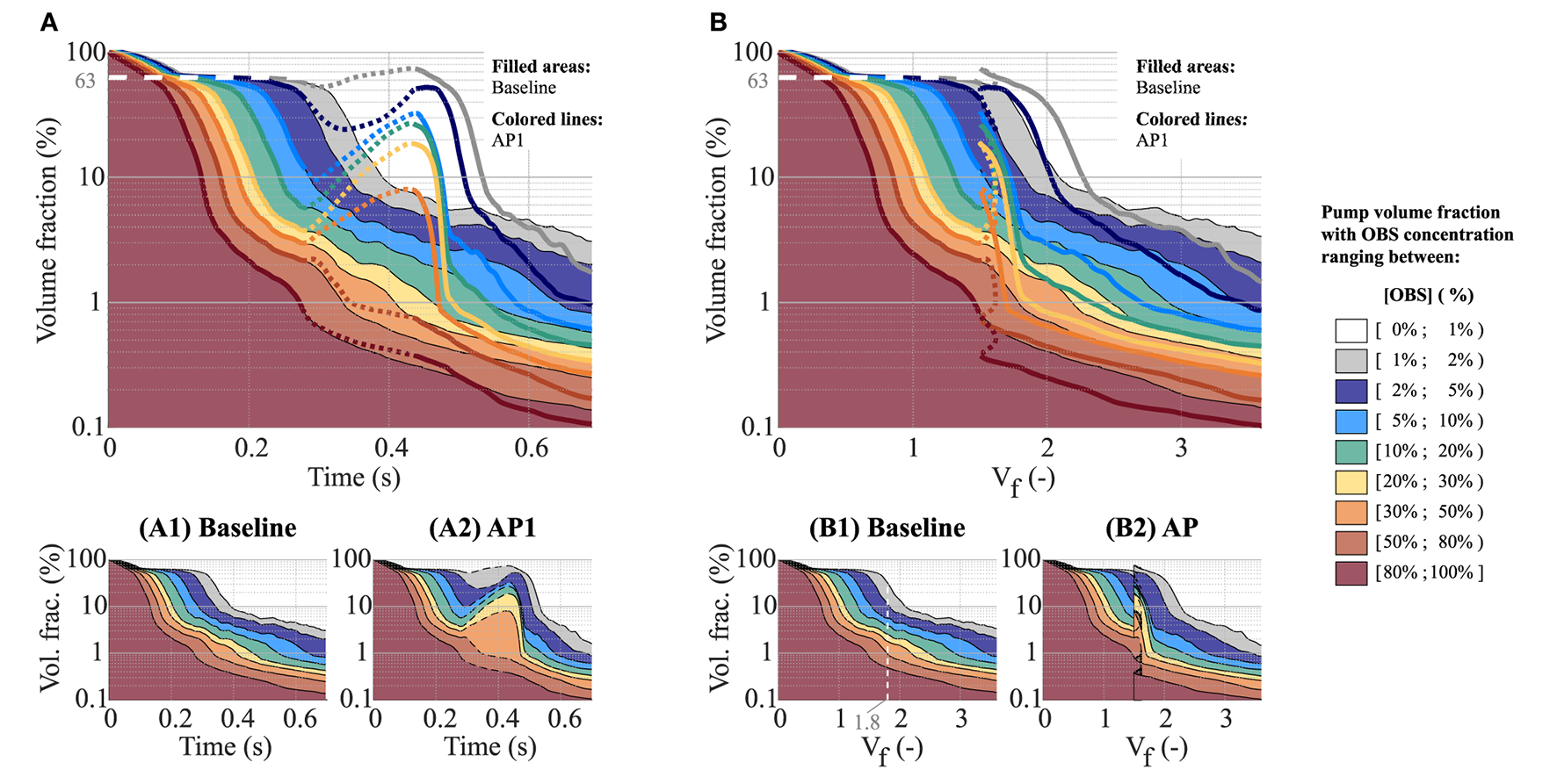 Effect of the AP on the fraction of the pump volume with high to low OBS concentrations as a function of time (A,A1,A2) and flush volume (B,B1,B2). (A1,A2,B1,B2) show the results for baseline and AP1 individually. The dashed contour lines highlight the low-speed phase of the AP, which, due to the associated flow reversal, leads to a transient decrease in the net flush volume, Vf(B2). (A,B) To ease the comparison between baseline and AP1, (A,B) show the superposition of (A1,A2,B1,B2), respectively. The colored areas depict the results under baseline conditions [corresponding to (A1,B1), respectively], while the thick colored lines correspond to AP1 [corresponding to (A2,B2), respectively]. Here again, the dashed lines highlight the low-speed phase of the AP. Note that, for all the panels, a logarithmic scale is used for the Y-axis.