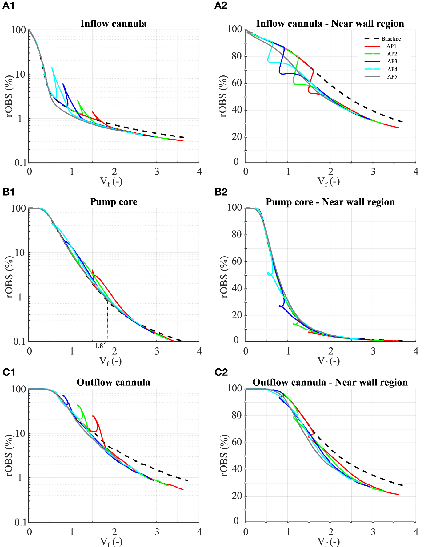 Compared to baseline, the AP leads to a transient increase in rOBS in the different pump parts followed by a faster and deeper OBS clearance during the acceleration phase (leading to the aforementioned “shark fin” feature, Figures 5A1–C1). By reverting flow direction along the walls, flow reversal favors clearance of the near-wall regions consistent with the decay of high volume with high OBS concentrations noted in Figure 4. The cumulative effect of the low- and high-seed phases is negligible in the pump core and strongest in the outflow cannula. After Vf = 2.0, rOBS in the outflow cannula is 1–1.5% lower with the AP than at baseline (Figure 5C1) and rOBS values in the near-wall regions of the inflow and outflow cannula are 5–12% lower than at baseline (Figures 5A2,C2). Improved near-wall washout accounts for more than 50% of the benefit observed in the inflow cannula, but only for 10–20% of the benefit noted in the outflow cannula.