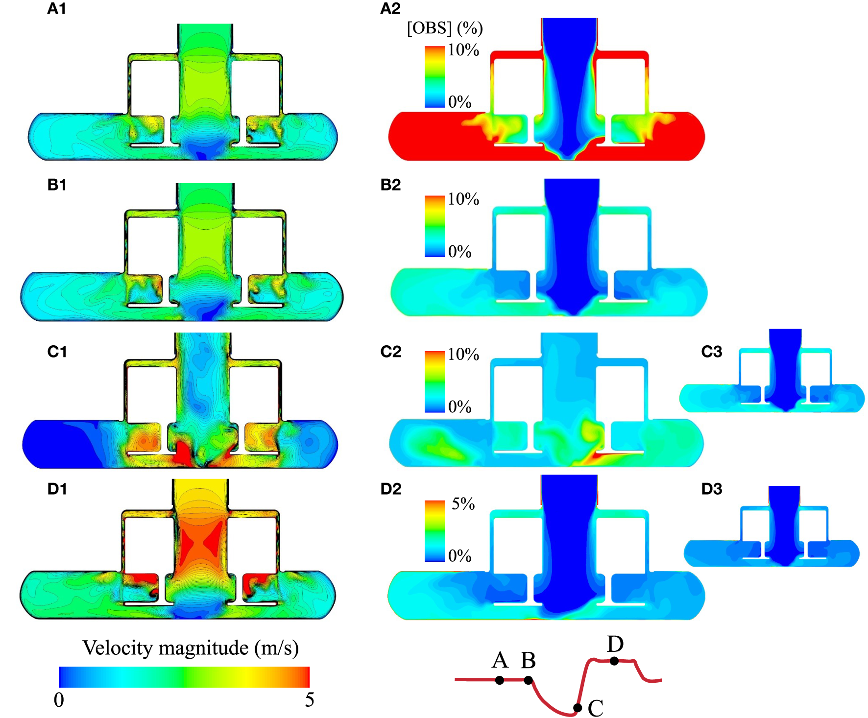 Comparison of the instantaneous velocity fields and evolution of the OBS concentrations in the pump core during the AP1 scenario. (A1–D1) Instantaneous velocity fields in the HM3 pump core for the four instants illustrated on the flow curve with the pump operating at baseline speed (5,650 rpm, instants A and B), low speed (3,650 rpm, instant C), and high speed (7,650 rpm, instant D). For AP1, the time points A, B, C, and D correspond to Vf = 0.9, 1.4, 1.5, and 2.0, respectively. (A2–D2) OBS concentrations at instants A, B, C, and D for the AP1 scenario. OBS concentrations are expressed as a percentage of the initial concentration [OBS]0. rOBS over the core pump for the AP1 scenario is 14.0, 2.6, 4.0, and 0.9% at the instants A, B, C, and D, respectively. (C3,D3) OBS concentrations in the pump core for Vf = 1.5 and 2.0 under baseline conditions, corresponding to the same flush volumes as instants C and D for AP1. Note that instants A and B apply to the baseline scenario as well, as the pump is operating under the set baseline speed at those time points.
