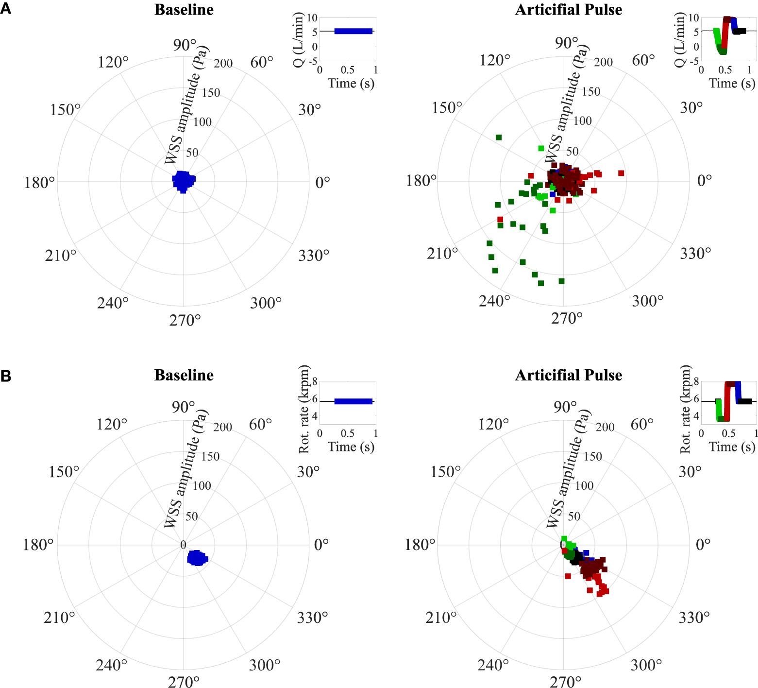 We monitored WSS close to the two above noted stagnation regions (Figure 8). Centrally under the rotor, WSS oscillates between 0.19 and 15.57 Pa at baseline, in line with the unstable stagnation point location noted above. These WSS increase over 100 Pa (maximum 576.20 Pa) during the flow reversal (Figure 6C1) and return close to their baseline value during the high-speed phase of the AP because the stagnation region remains in the same location as at baseline. In the mid-radial location of the upper surface of the rotor, maximum WSS reaches 41.49 Pa at baseline and vary from 8.63 to 100.50 Pa during the AP deceleration and acceleration phases. For both the baseline and AP, the WSS direction is mainly concentrated between 300 and 330°.