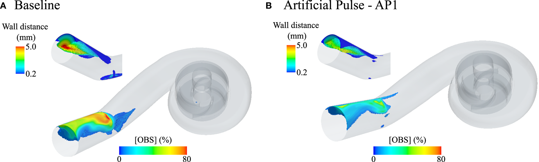 Fluid volumes in the HeartMate 3 (HM3) pump core and outlet cannula with residual OBS concentrations over 5% after flushing the pump with two times its blood volume (Vf = 2.0) without AP [(A), baseline conditions] and with AP [(B), AP1 scenario]. At Vf = 2.0, the average residual OBS concentration is 1.7 and 1.5% in the core pump for the Baseline and AP1 scenario, respectively, and is 4.5% at baseline and 3.5% for AP1 in the outlet cannula. For ease of visualization, only fluid volumes with [OBS] ≥ 5% and more than 200 μm away from the pump surfaces are shown. Apart from a small region under the rotor at baseline, no 5% OBS isovolume are identified in the pump core at that instance. The insets show the 5% OBS isovolumes in the outflow cannula color coded by wall distance to highlight the penetration depth of that region under baseline conditions and the effect of the AP on its clearance.