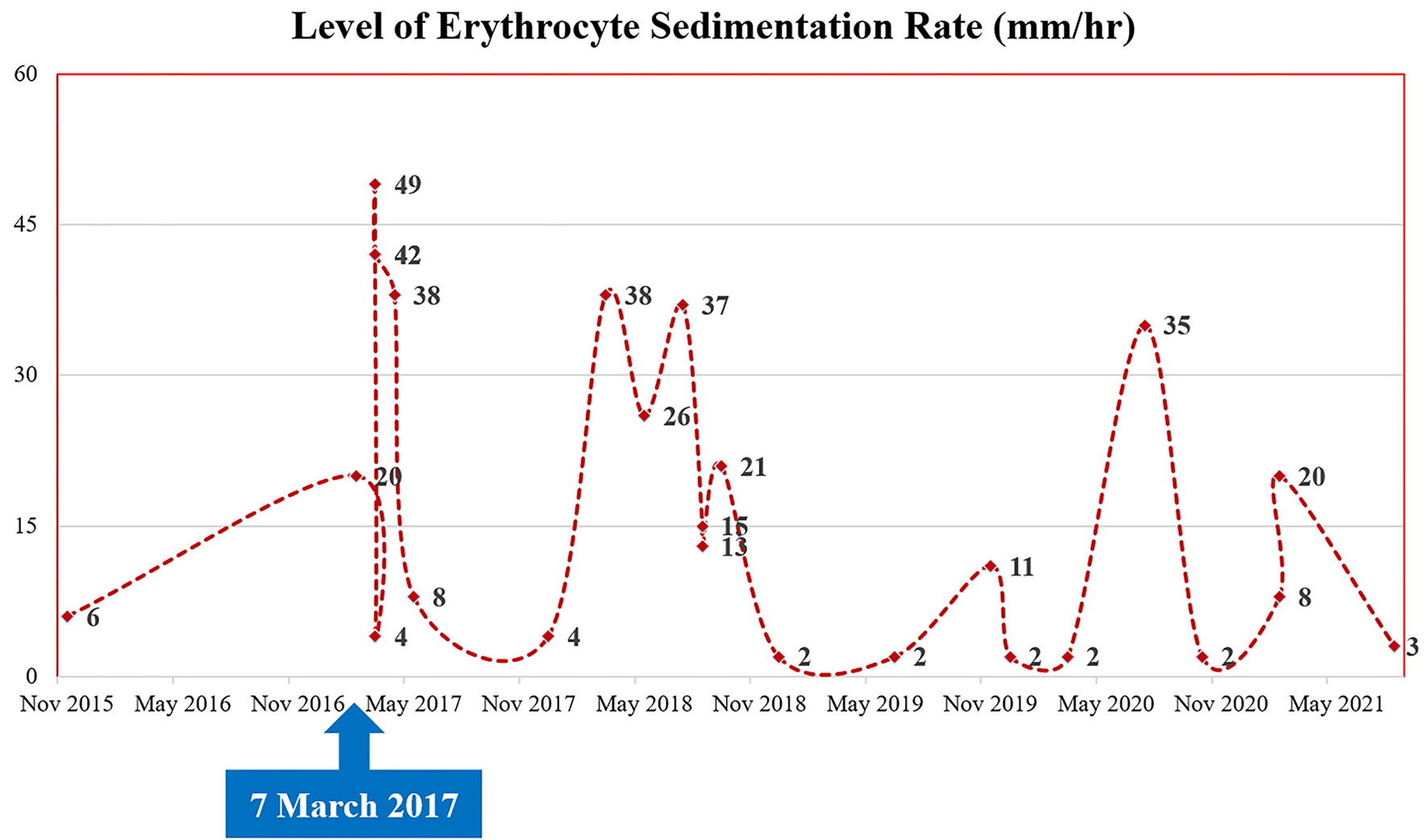 Patient's clinical course: the change of inflammatory markers (levels of erythrocyte sedimentation rate).