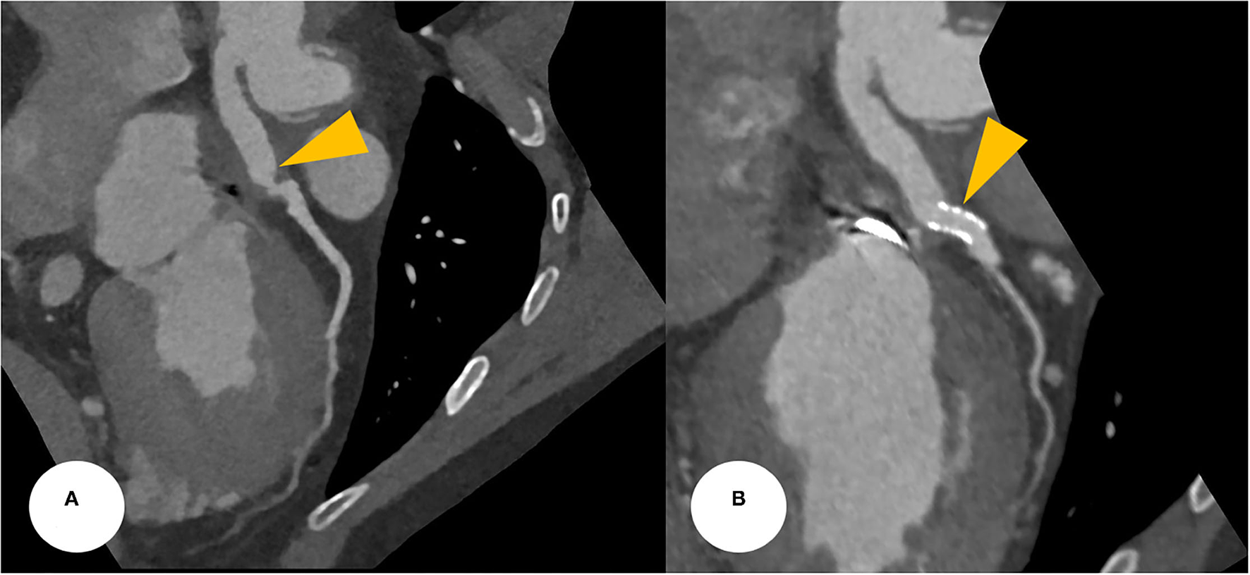 (A) CCTA at the postoperative period found a focally narrowed and kinked lesion at the anastomotic site between the Cabrol-type graft and LMCA (a yellowish arrowhead). (B) After a successful PCI, CCTA was evaluated, revealing a stent deployment state between the conduit and LMCA with good patency (yellowish arrowheads). CCTA, coronary computed tomography angiography; LMCA, left main coronary artery; PCI, percutaneous coronary intervention.
