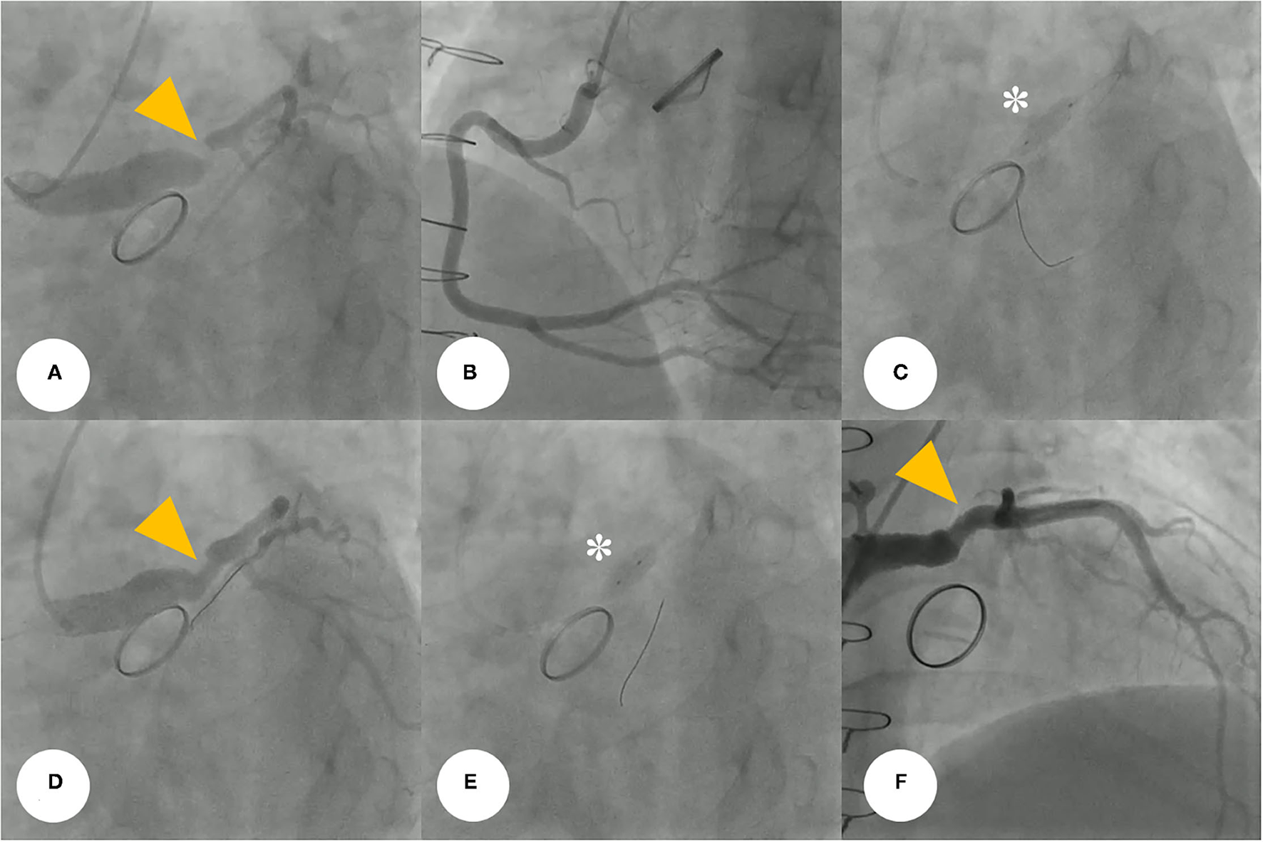 (A) Coronary angiogram demonstrates severe post-anastomotic left main coronary artery stenosis (yellow arrowhead) in a patient with Behçet's disease after a previous modified Bentall procedure. (B) Right-selective coronary angiogram shows no significant stenosis. (C) For this stenotic lesion, we used a drug-eluting stent (asterisk) (4.5 × 12 mm, SynergyTM, Boston Scientific, Marlborough, MA, USA). (D,E) The repeated coronary angiogram shows residual stent under-expansion (yellow arrowhead), hence, a non-compliant balloon (asterisk) (5.5 × 8 mm, Raiden 3TM, Kaneka Corporation, Osaka, Japan) was post-dilated. (F) Final coronary angiogram showing an optimal angiographic result (yellow arrowhead).