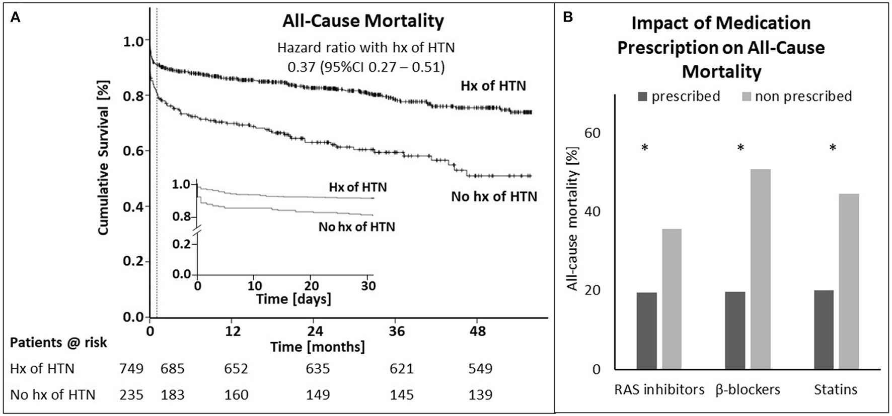 Mean age was 64 ± 13 years, 246 (25%) were women. 749 (76%) patients had a history of hypertension. All-cause mortality was 24.2%, 30-day and 1-year mortality was 11.3% and 16.6%, respectively. History of hypertension correlated with lower mortality (hazard ratio [HR], @30 days: 0.41 [0.27-0.62], @1 year: 0.37 [0.26-0.53]). After adjusting for age, sex, Killip-class, diabetes mellitus, body-mass index, kidney function and statin prescription at discharge 1-year mortality HR was 0.24 (0.12-0.48). At discharge, prescription rates for RAS-inhibitors, β-blockers and statins, as well as individual dosing and long-term persistence of RAS-inhibitors were higher in patients with history of hypertension. On the same lines, prescription rates for RAS-inhibitors, β-blockers and statins at discharge correlated significantly with lower mortality regardless of history of hypertension.