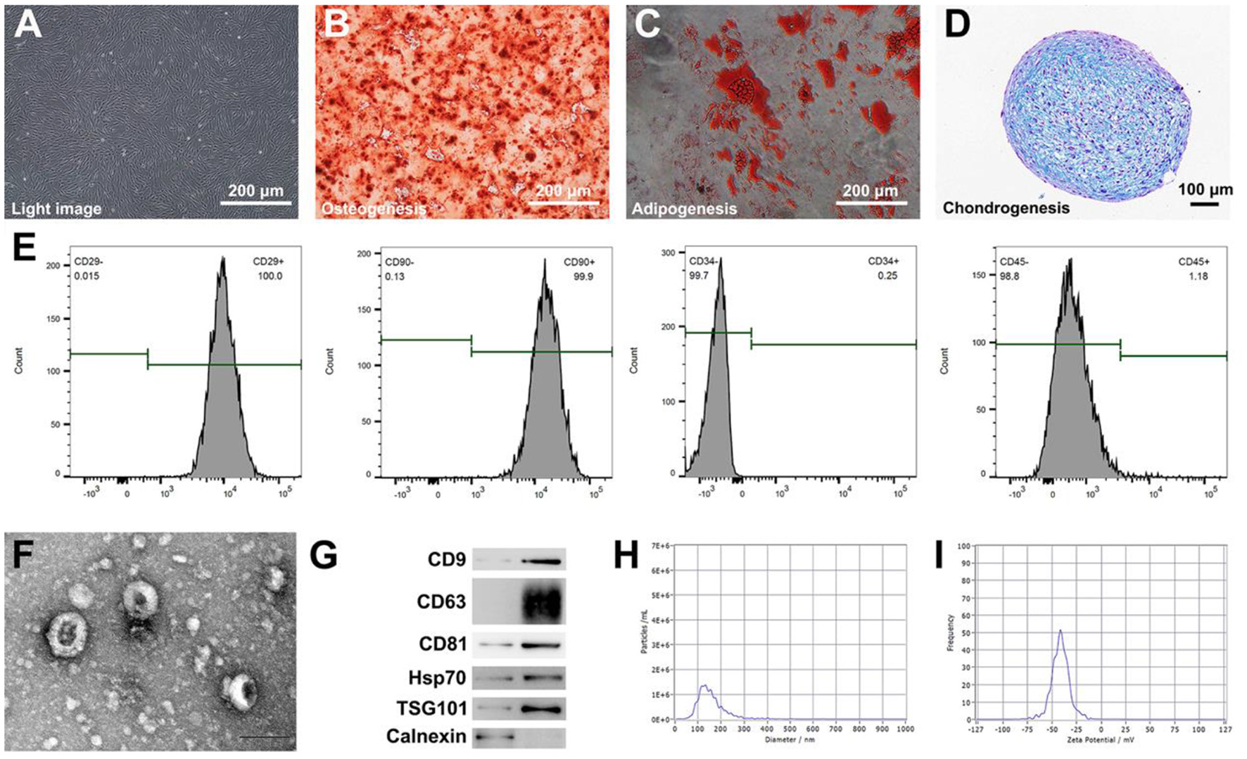 Characterization of ADSCs and ADSC-derived biomimetic nanovesicles. (A) The morphology of ADSCs by using a microscope. Scale bar = 200 μm. (B–D) Osteogenic, adipogenic, and chondrogenic differentiation of ADSCs. Scale bar = 200 μm. (E) Analysis of flow cytometry indicating surface markers of ADSCs. (F) The characteristic image of ADSC-derived biomimetic nanovesicles under TEM. Scale bar = 100 nm. (G) Western blot analysis of nanovesicles' positive markers including CD9, CD63, CD81, Hsp70, and TSG101. Calnexin was used as the negative control. (H,I) Size distribution and zeta potential of nanovesicles.