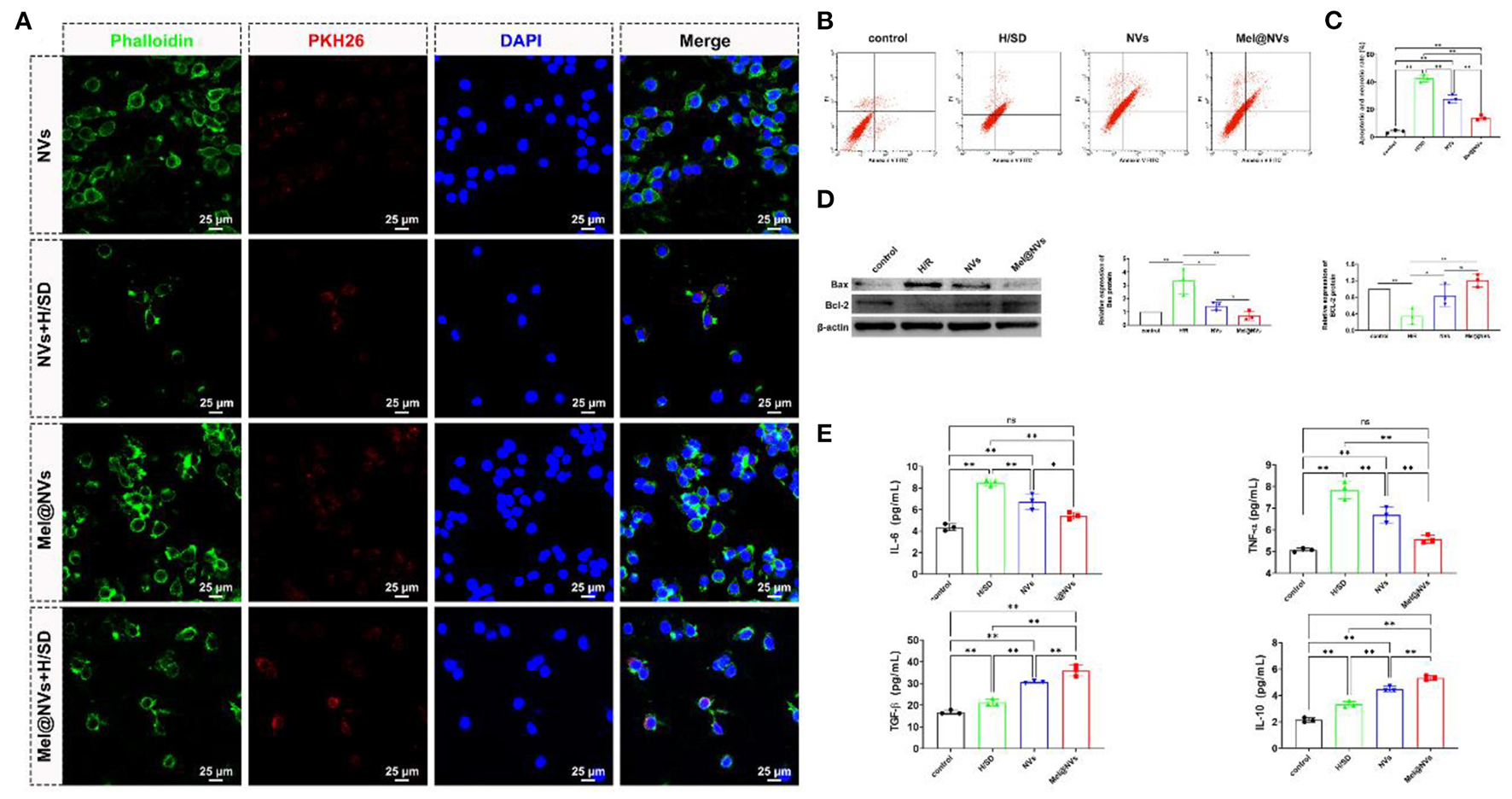 Cellular uptake and cardioprotective effects of Mel@NVs in H9C2 cells. (A) Representative images of NVs and Mel@NVs taken up by H9C2 cells in control and H/SD conditions. (B) The apoptotic rate of annexin-V/PI staining in different conditions by using flow cytometric detection. (C) The analysis of the quantity of apoptotic and necrotic cells by flow cytometry (**p < 0.01). (D) Detection of apoptosis-related proteins using Western blotting test. (E) The amount of anti-inflammatory and pro-inflammatory cytokines using ELISA in H9C2 cells with different treatments (*p < 0.05; **p < 0.01; ns, not significant. n = 3).