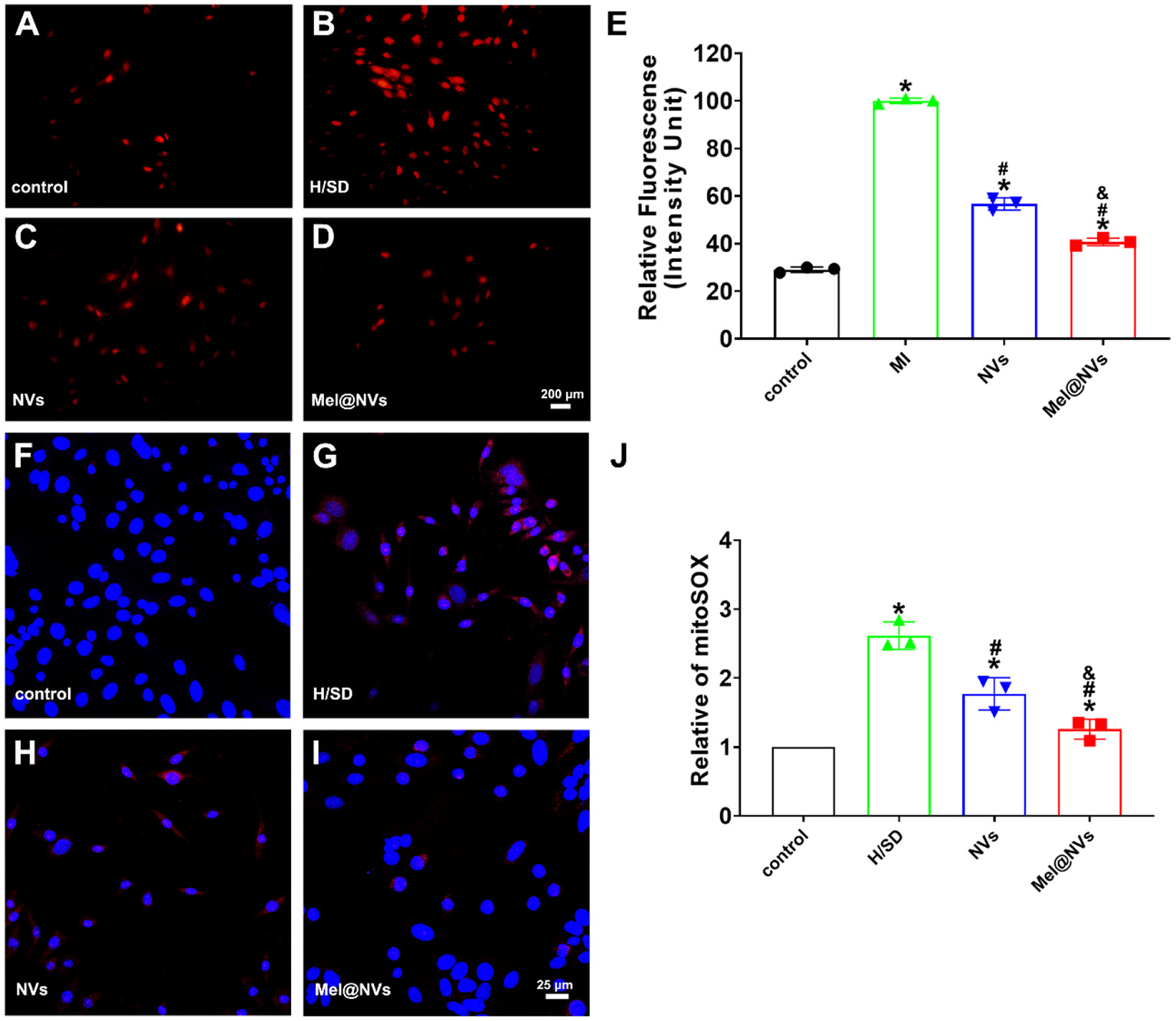 The effect of Mel@NVs on reactive oxygen species levels in H/SD condition. (A–D) The ROS levels in cells by using DHE probe and the images were obtained using fluorescence microscopy. Scale bar = 200 μm. (E) The quantification of the DHE fluorescence intensity is shown in a bar graph (*p < 0.05 v.s. control; #p < 0.05 v.s. H/SD treatment; &p < 0.05 v.s. NVs treatment). (F–I) The oxygen species levels in mitochondria were observed by using a Mito-SOX probe and the images were obtained using confocal laser scanning microscopy. Scale bar = 25 μm. (J) The quantification of Mito-SOX fluorescence intensity is detected in different assays (*p < 0.05 v.s. control; #p < 0.05 v.s. H/SD treatment; &p < 0.05 v.s. NVs treatment). The results represented the mean ± standard deviation (n = 3).