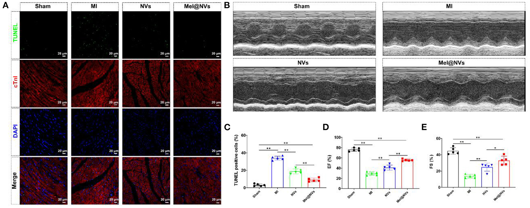In summary, our results showed that Mel@NVs protected the vitality of myocardial cells in vitro by reducing oxidative stress damage and apoptosis, and infarcted myocardial tissue in vivo. Through the use of the myocardial infarction model, it has been confirmed that the designed Mel@NVs play a therapeutic role in cardiac repair. Therefore, engineered nanovesicles will provide a potential strategy for the treatment of myocardial infarction.